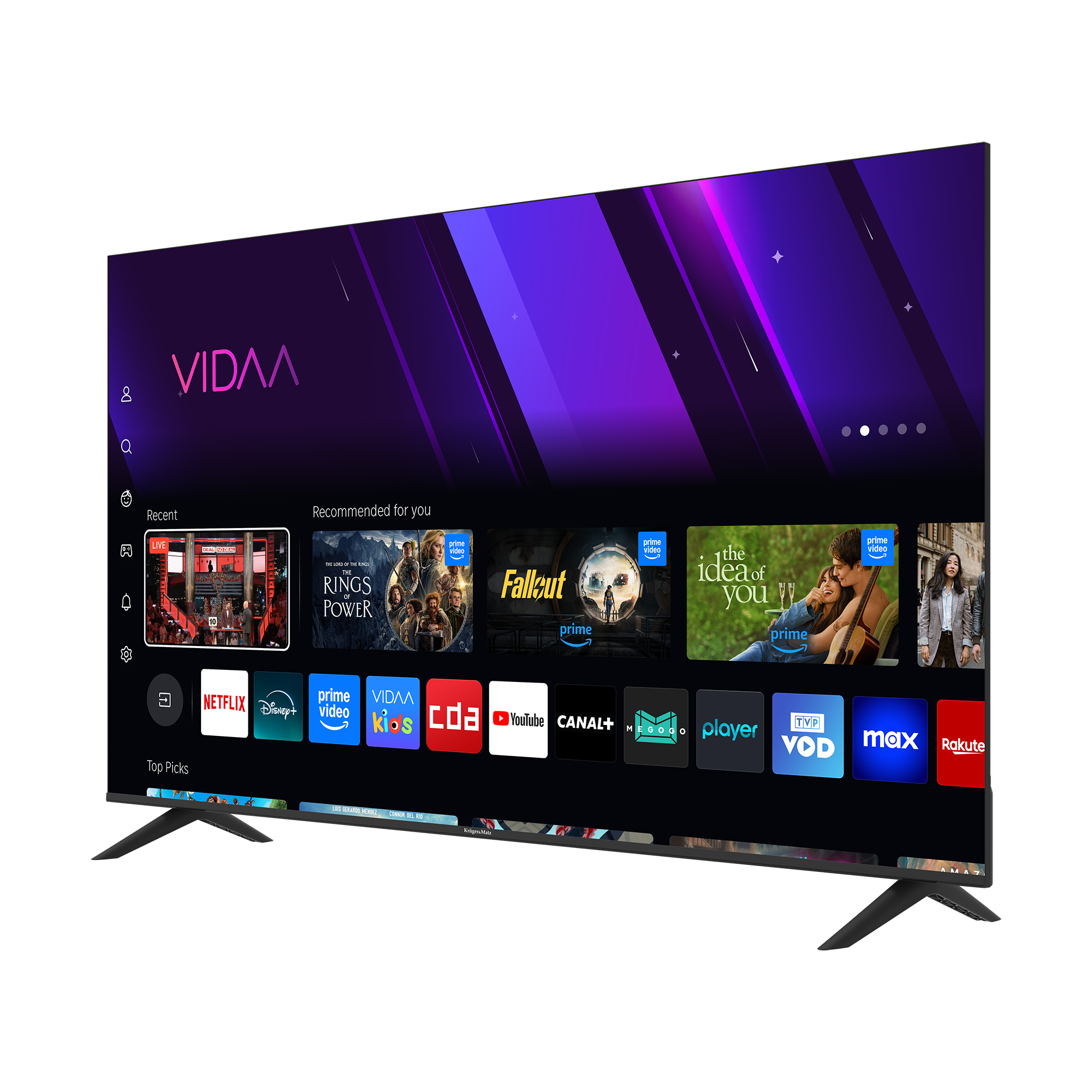 To, co wyróżnia telewizor smart tv Kruger&Matz KM0250UHD-V3, to zastosowanie VIDAA, czyli jednego z najszybszych i najbardziej intuicyjnych systemów operacyjnych smart TV. Dzięki temu, zaraz po włączeniu telewizora Kruger&Matz masz dostęp do szerokiej gamy funkcji i rozrywki.