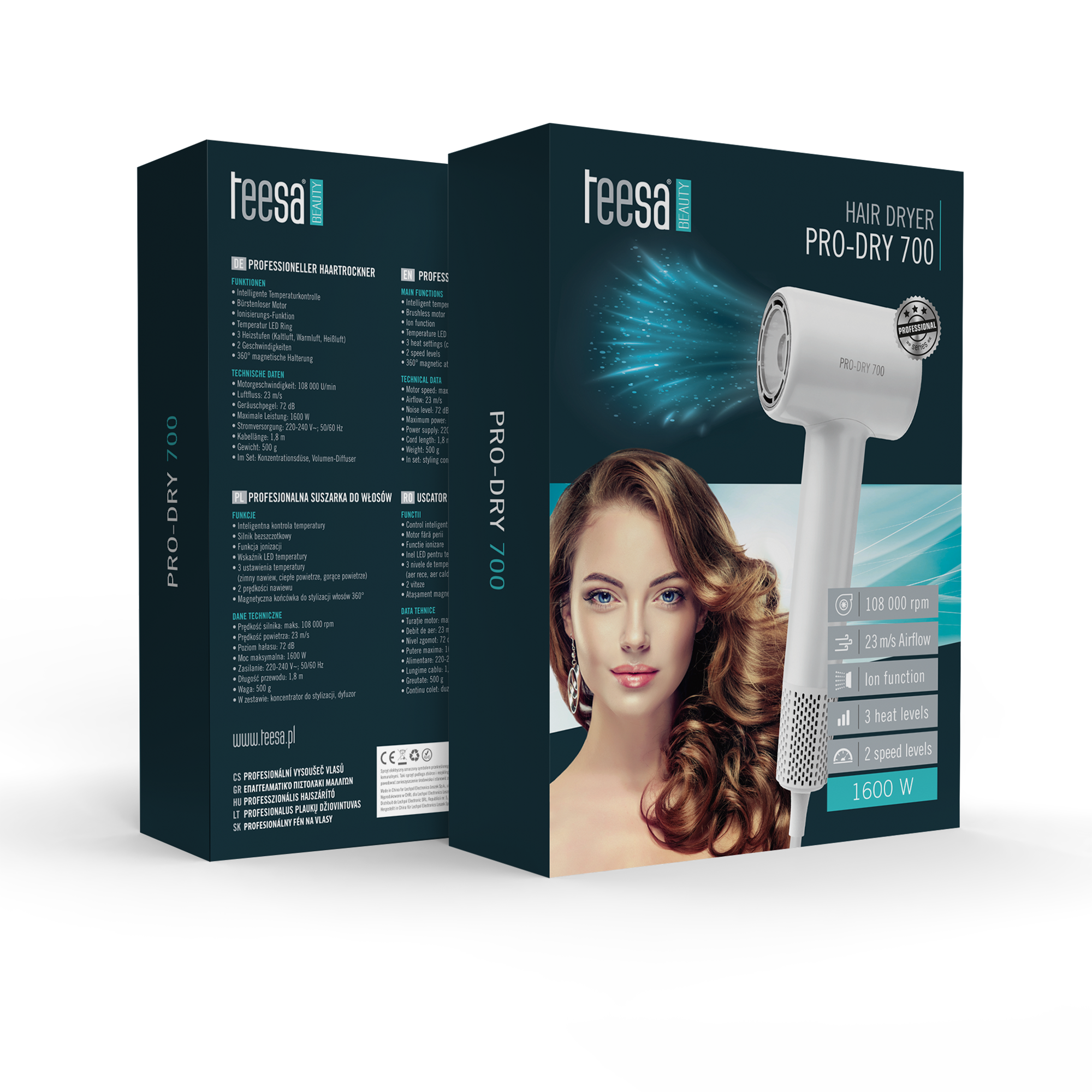 Suszarka do włosów TEESA PRO DRY 700 to nowoczesne rozwiązanie stworzone z myślą o wygodnej i skutecznej stylizacji włosów. Łączy zaawansowaną technologię z lekką konstrukcją i wydajnym silnikiem, zapewniając szybkie suszenie oraz ochronę włosów. Idealna do codziennego użytku i precyzyjnego modelowania – dla osób, które oczekują profesjonalnych efektów w domowym zaciszu.