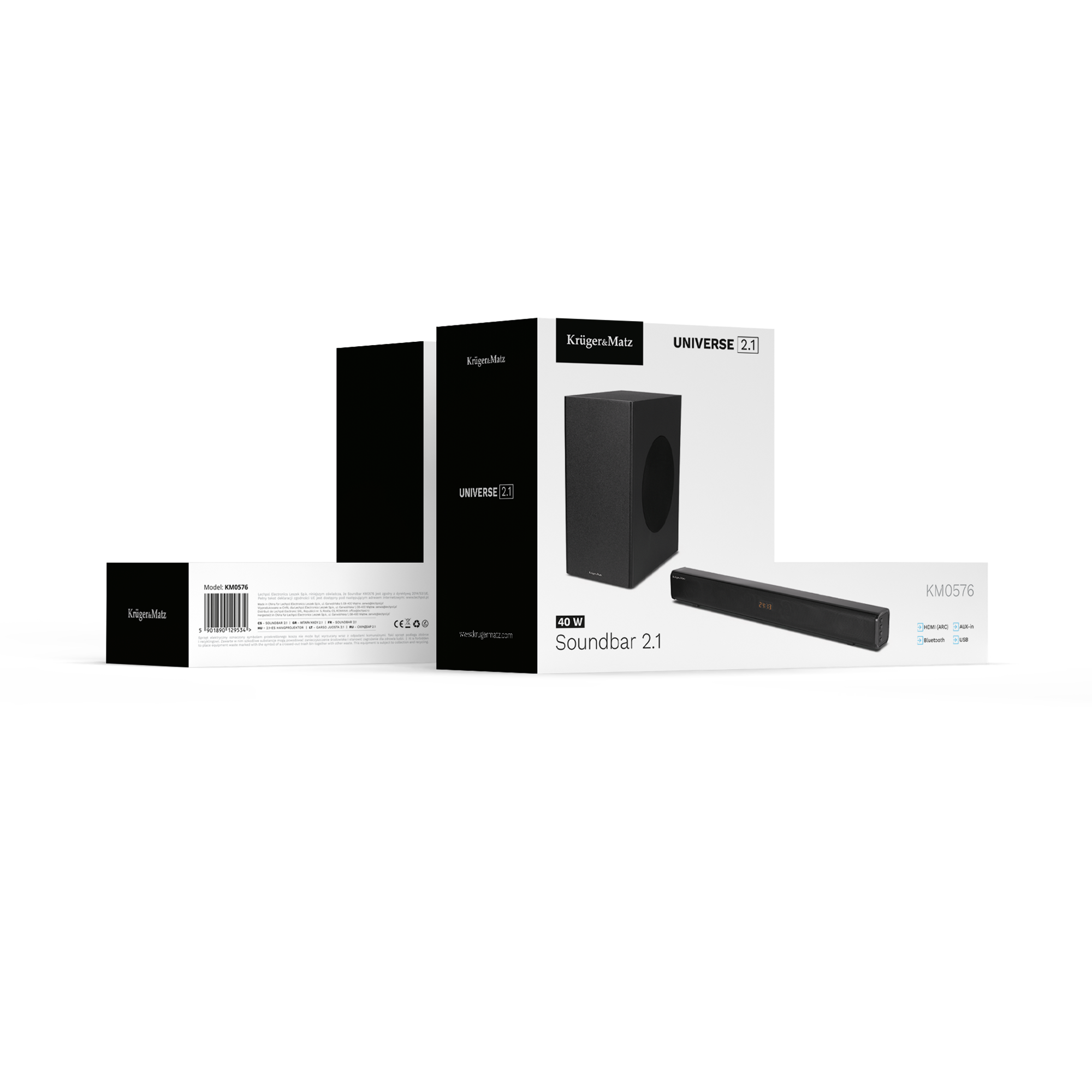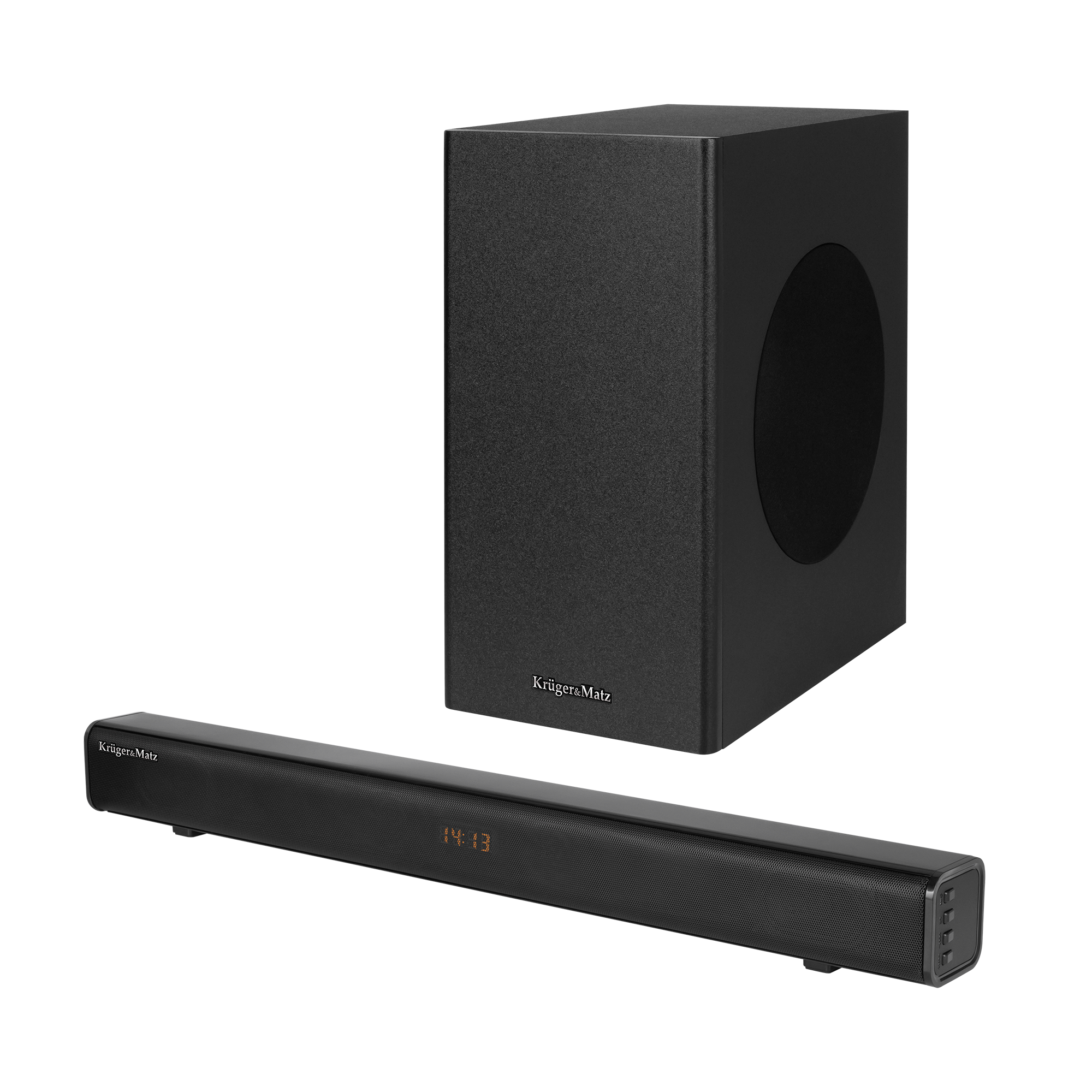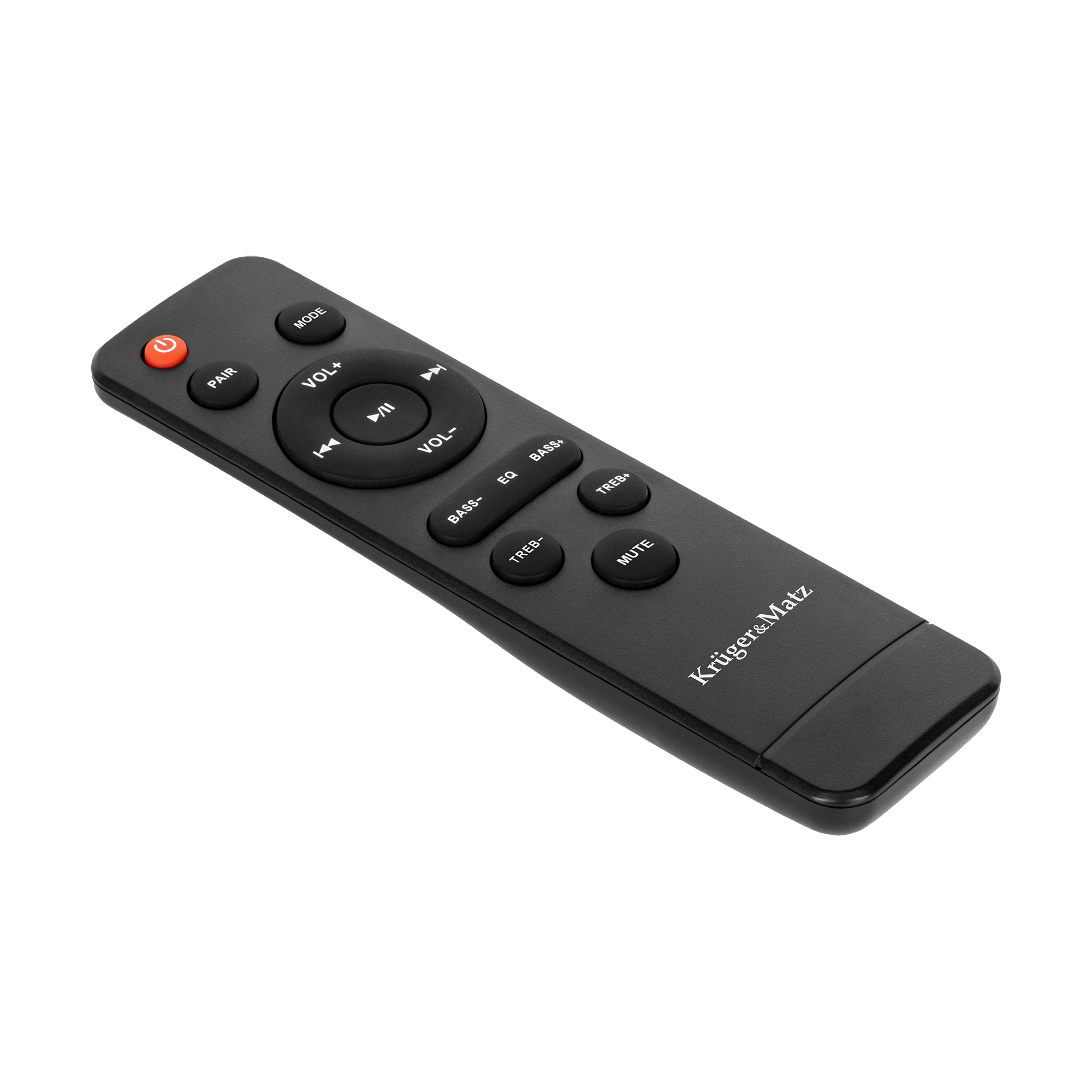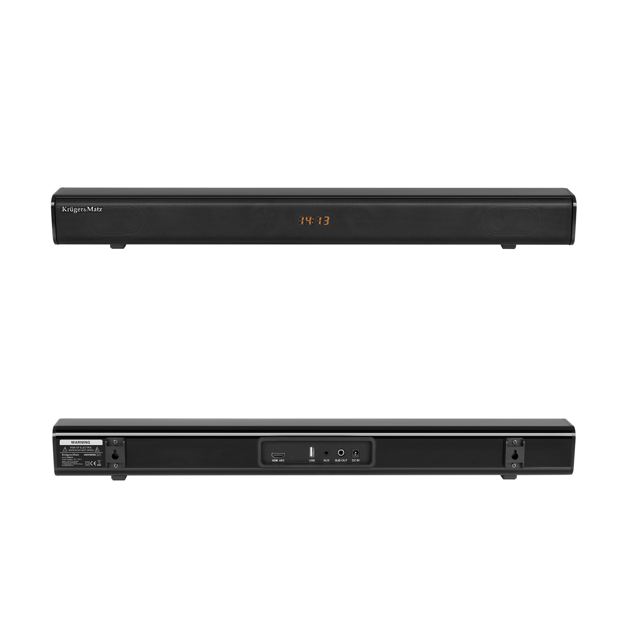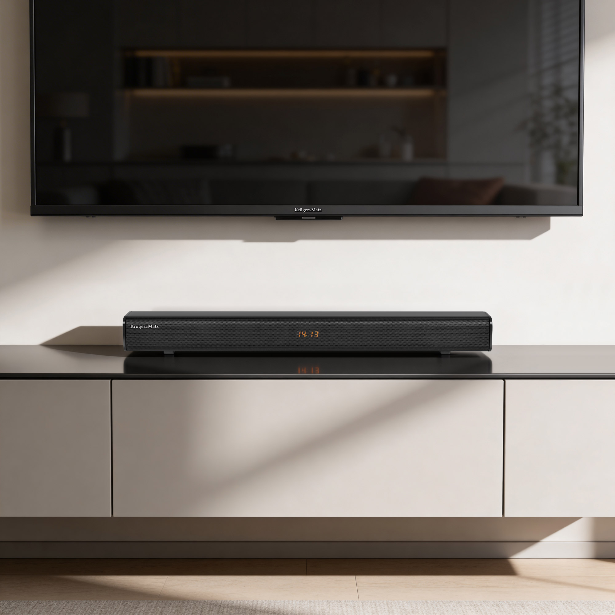 Soundbar Kruger&Matz oferuje dodatkowe możliwości odtwarzania dzięki portowi USB oraz wejściu AUX (Jack 3,5 mm). Port USB umożliwia odtwarzanie plików MP3 zapisanych na pamięciach przenośnych, natomiast wejście AUX pozwala podłączyć różne urządzenia audio, takie jak odtwarzacz MP3, komputer czy starszy model telewizora. Dzięki temu sprzęt jest uniwersalny i kompatybilny z wieloma źródłami dźwięku.