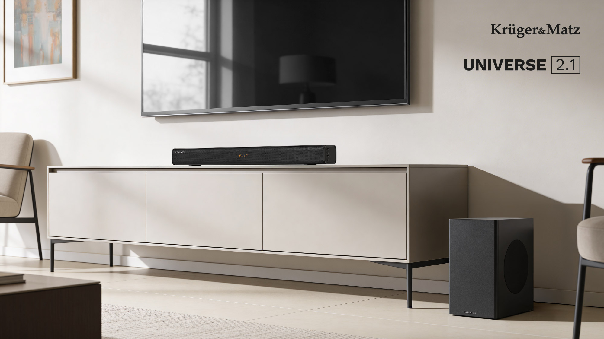 Soundbar Universe 2.1 to kompaktowe rozwiązanie audio stworzone z myślą o poprawie jakości dźwięku telewizora w domu. Sprawdzi się podczas oglądania filmów, seriali, transmisji sportowych czy słuchania muzyki. Dzięki niewielkim wymiarom pasuje do salonu, sypialni lub pokoju młodzieżowego. To dobry wybór dla osób, które chcą uzyskać pełniejszy i bardziej dynamiczny dźwięk bez rozbudowanego systemu kina domowego.