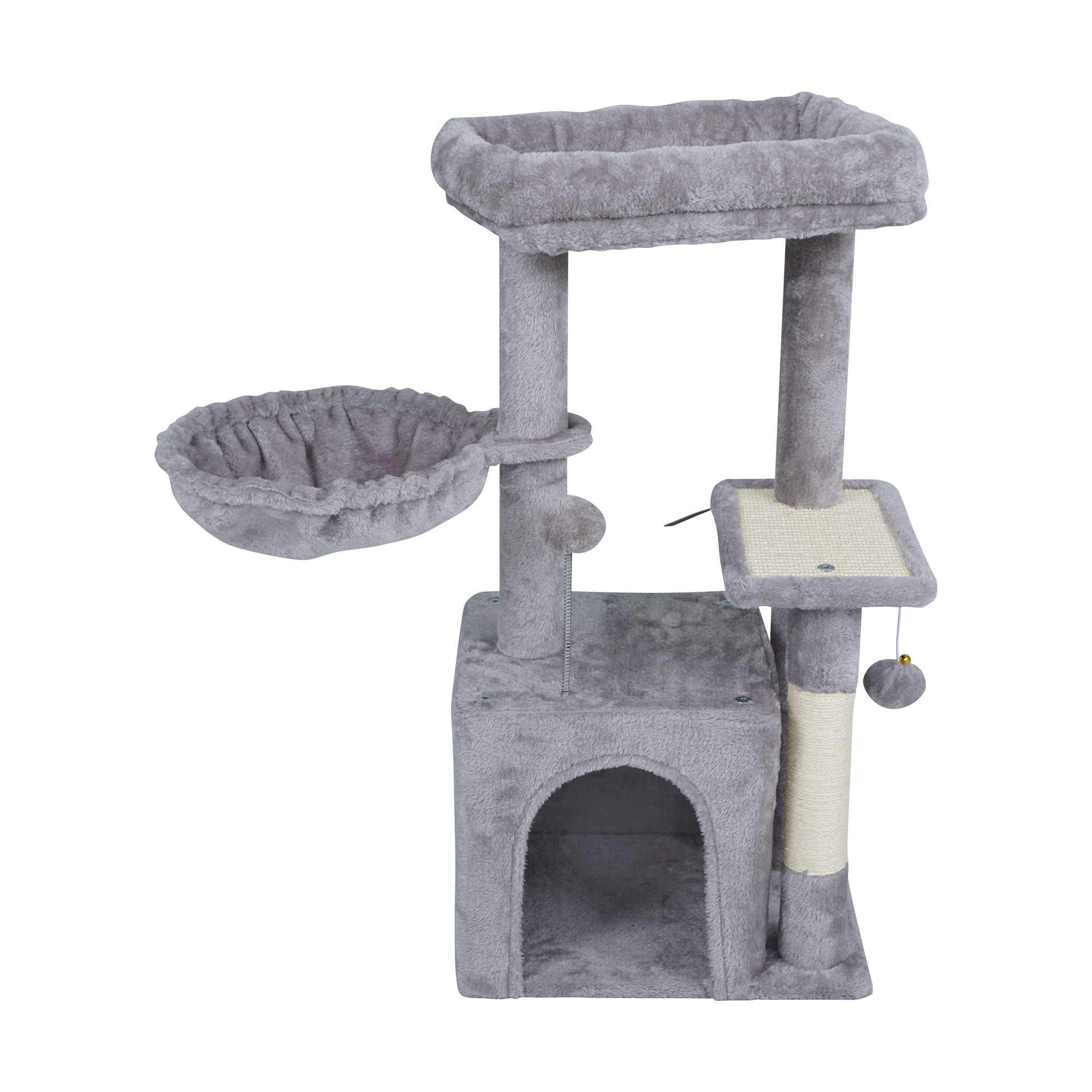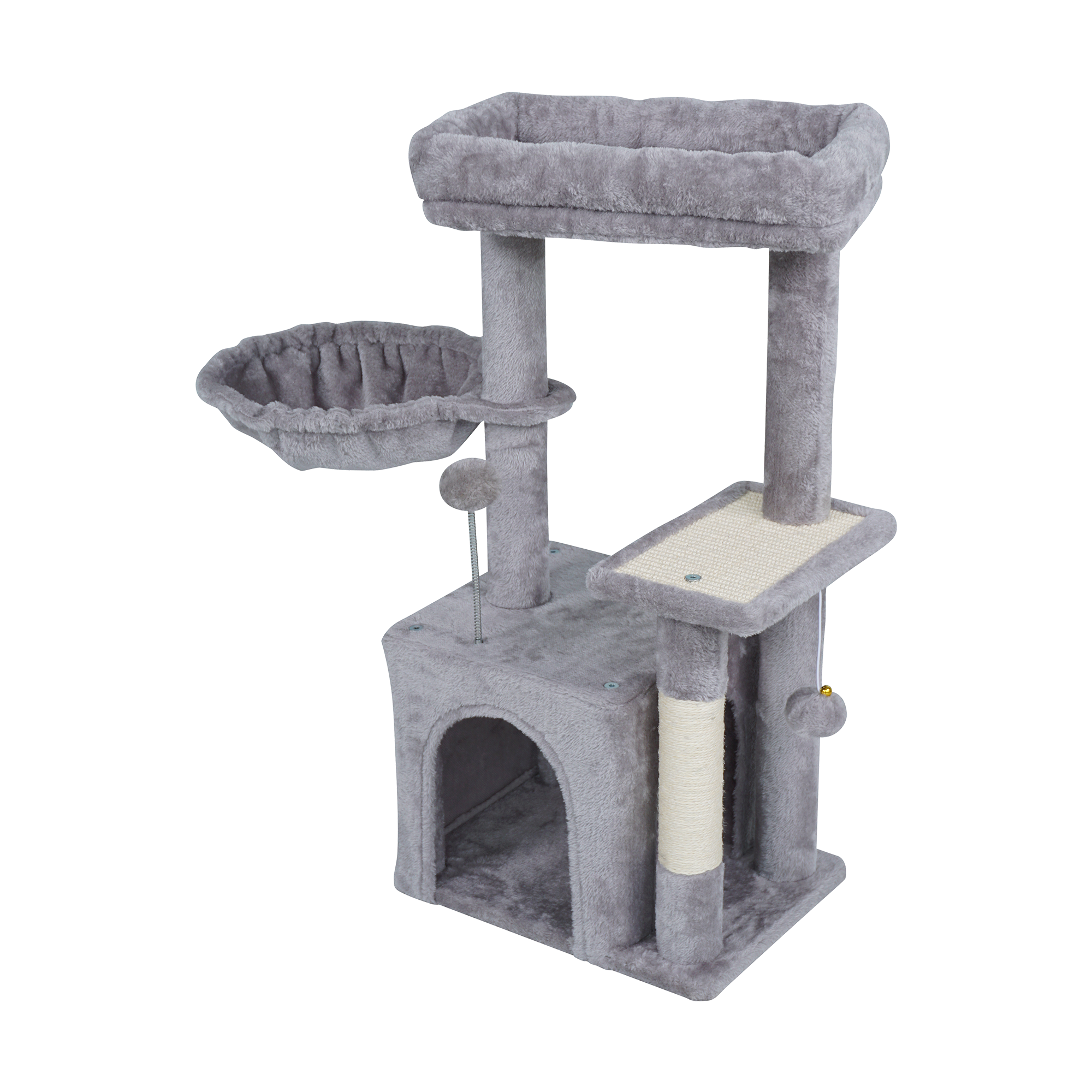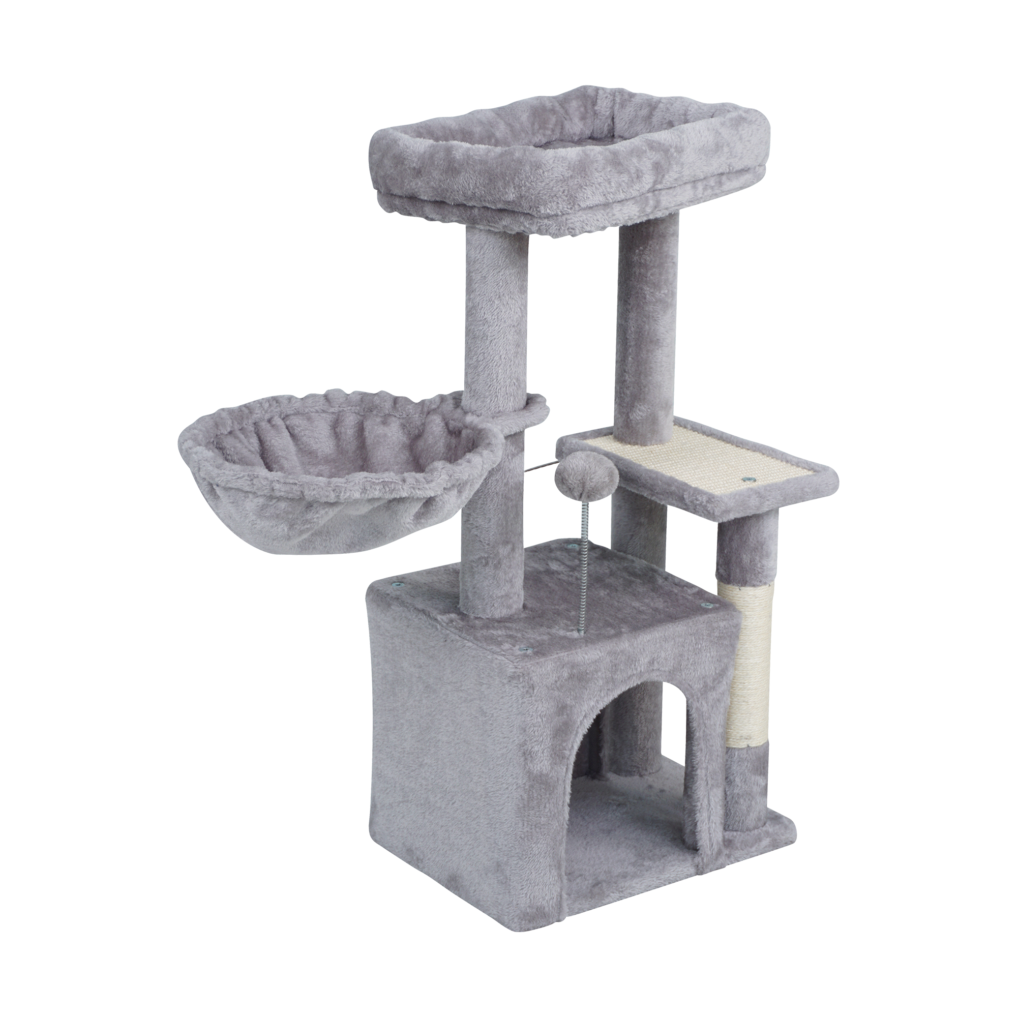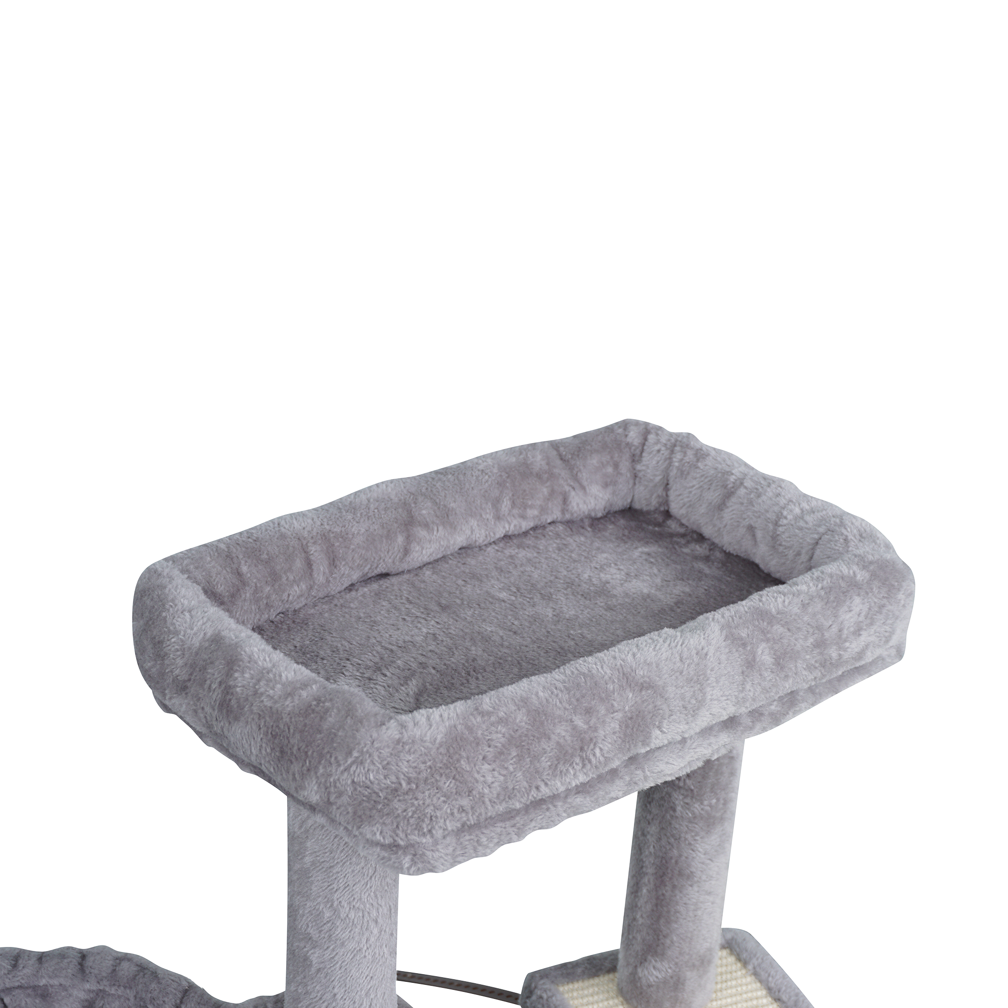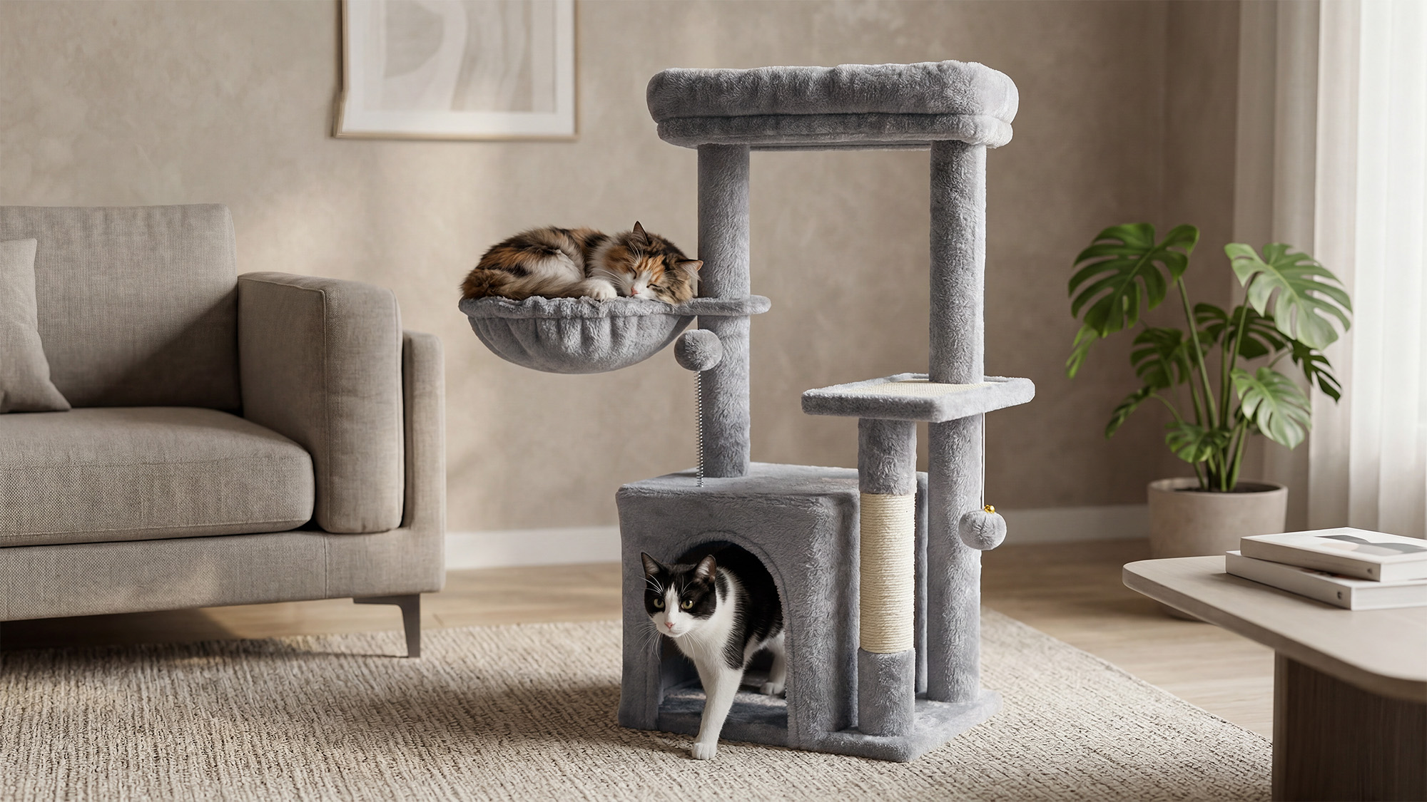 Drapak oferuje dwa wygodne miejsca do odpoczynku – legowisko na szczycie oraz dodatkowe okrągłe legowisko. Miękkie, pluszowe wykończenie zapewnia komfort i sprzyja relaksowi po zabawie. Różne poziomy pozwalają kotu wybrać ulubione miejsce do obserwacji otoczenia lub spokojnej drzemki.