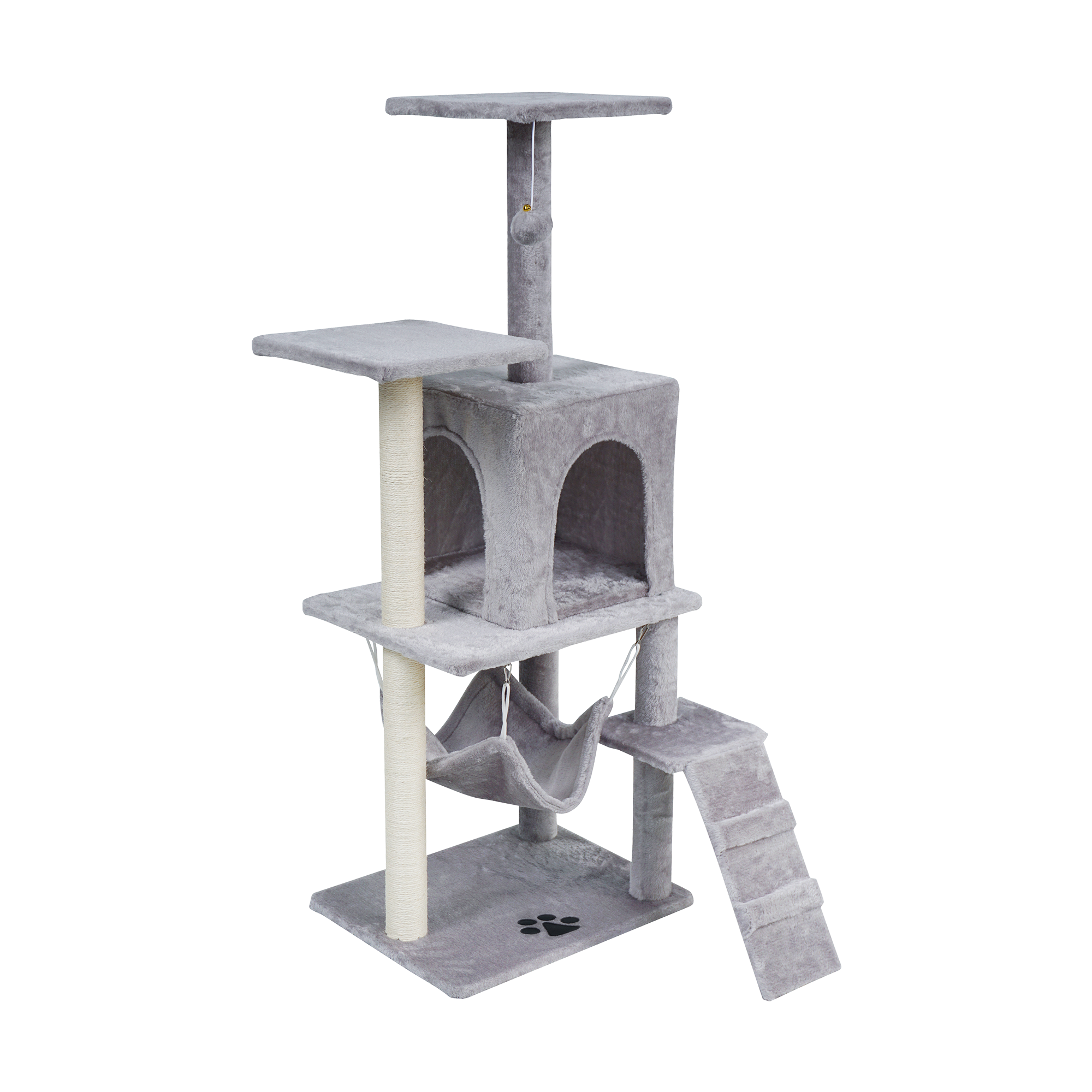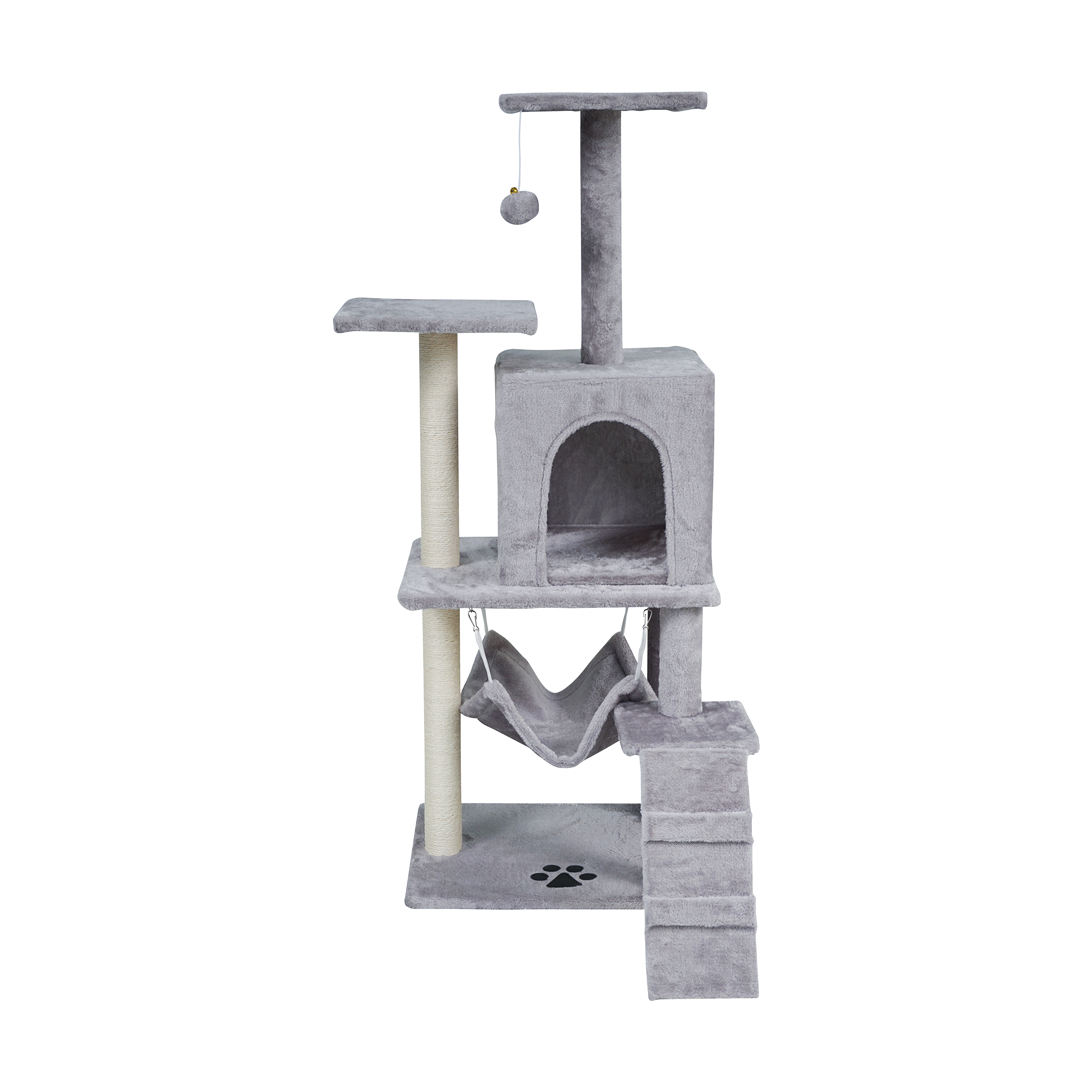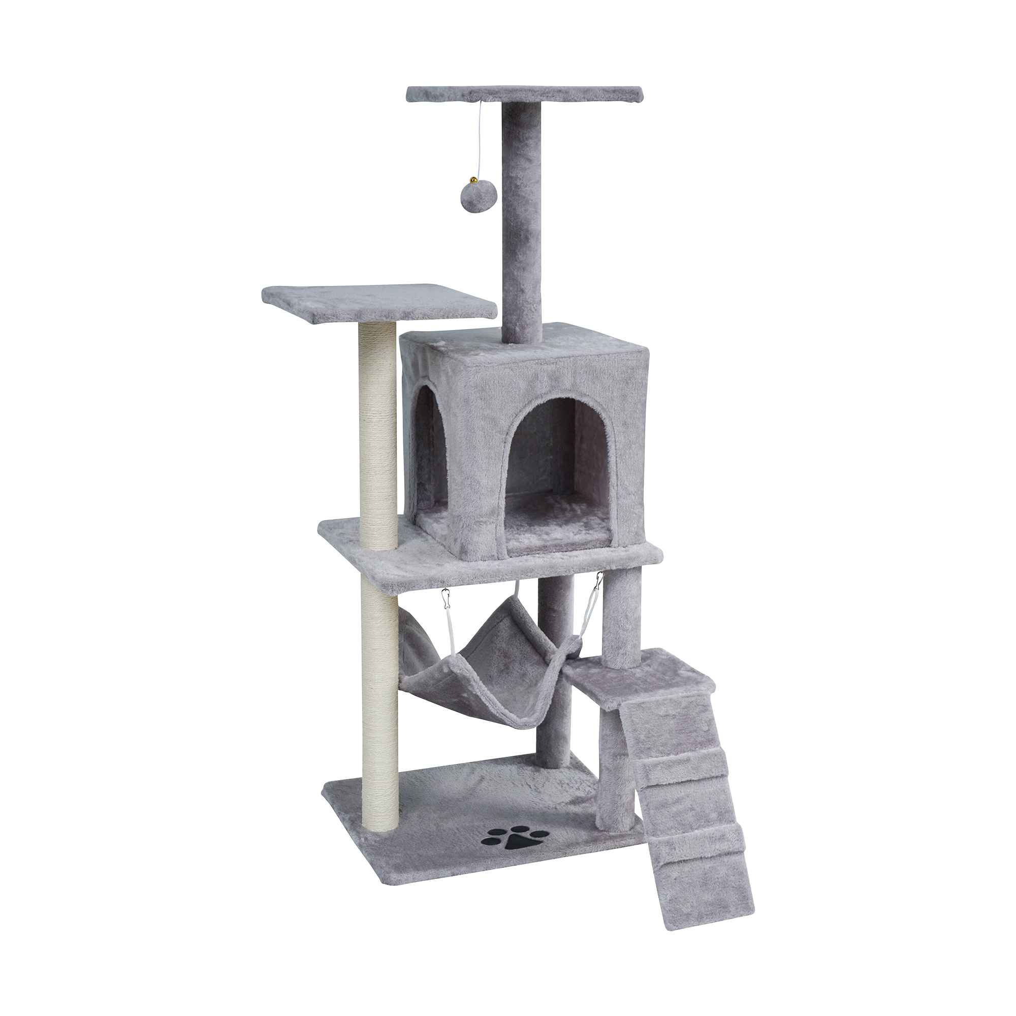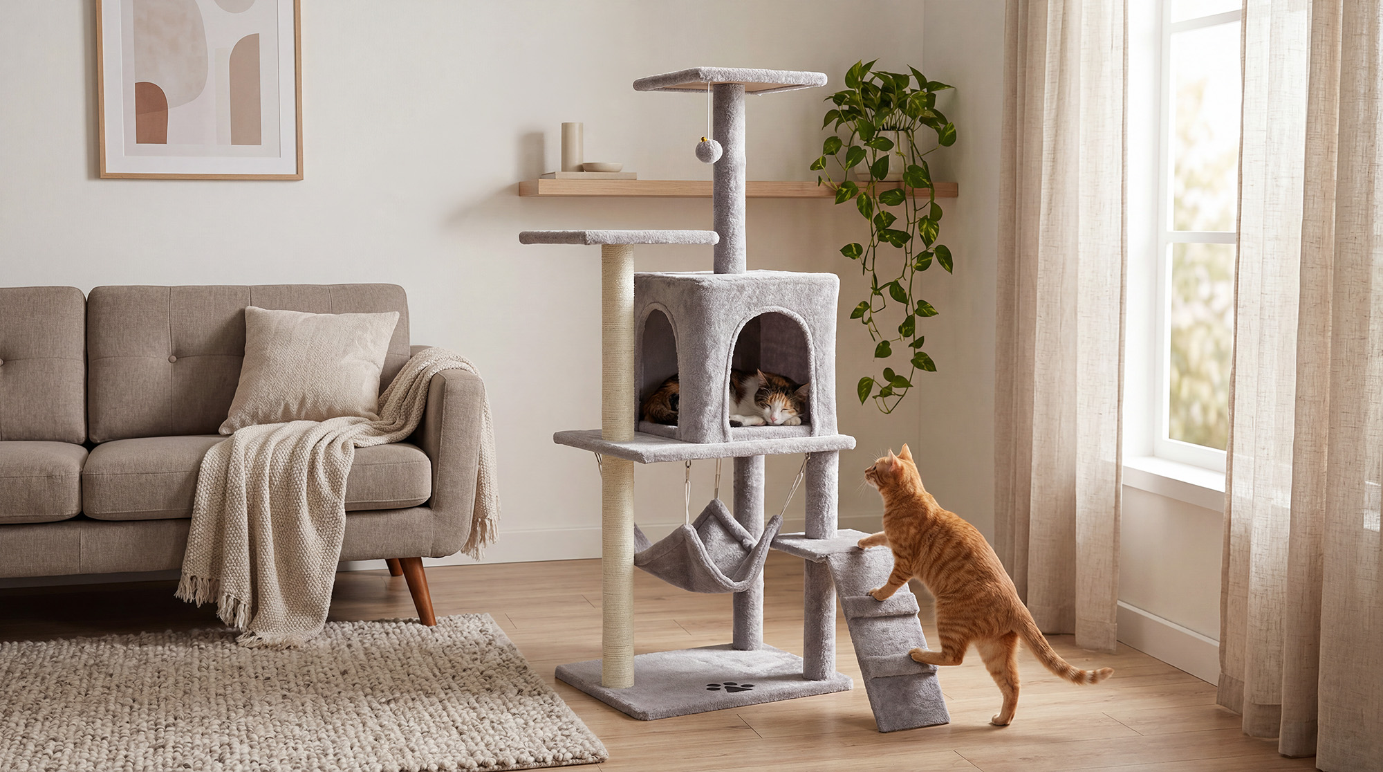 Wielopoziomowa konstrukcja z trzema platformami oraz dodatkowymi schodkami umożliwia kotu swobodne przemieszczanie się i wspinaczkę. Różne wysokości zachęcają do aktywności i pozwalają na obserwację otoczenia z góry. To idealne rozwiązanie dla kotów, które uwielbiają ruch i eksplorację przestrzeni.