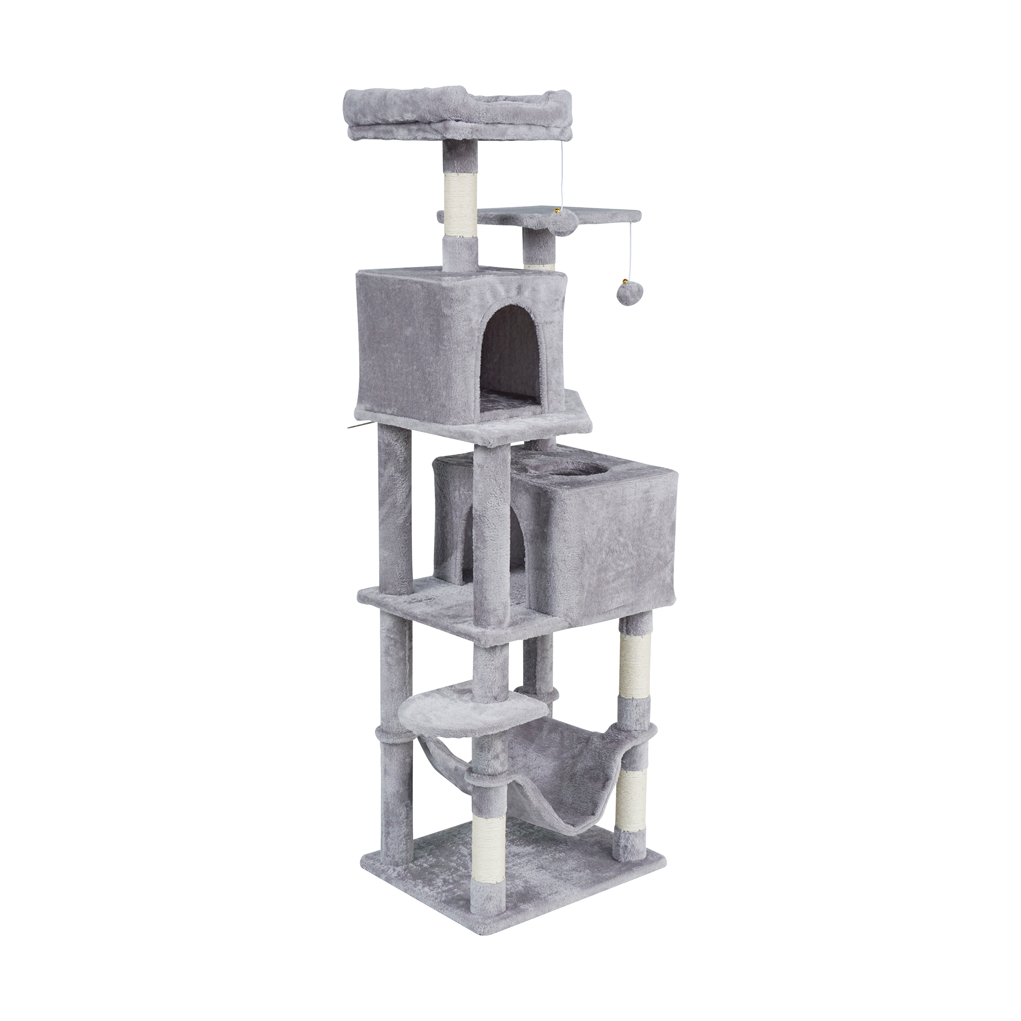 Dwa przytulne domki, w tym jeden z otworem w dachu oraz liczne platformy na różnych wysokościach tworzą atrakcyjne środowisko do zabawy i eksploracji. Kot może wspinać się, obserwować otoczenie z góry lub schować się w domku, co zapewnia różnorodność i stymuluje naturalną ciekawość.