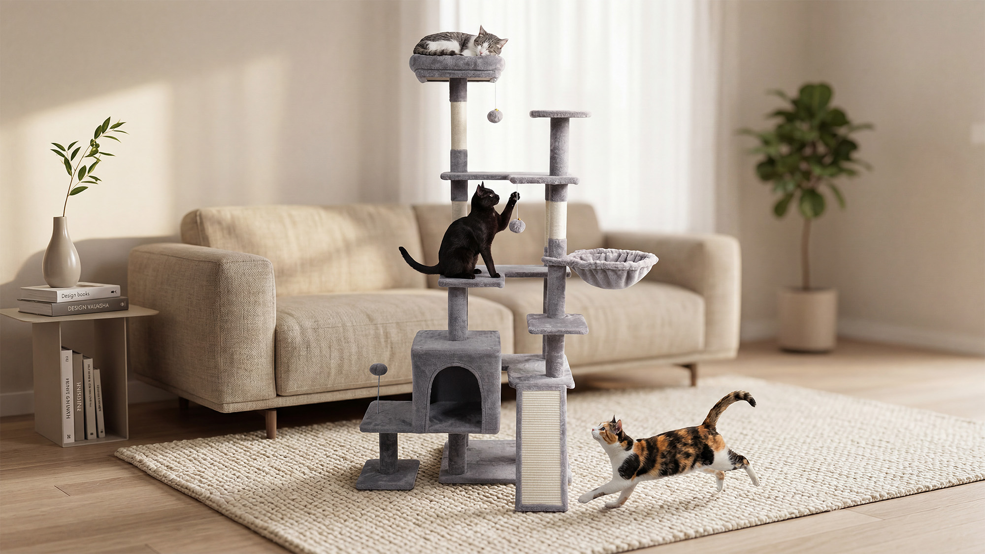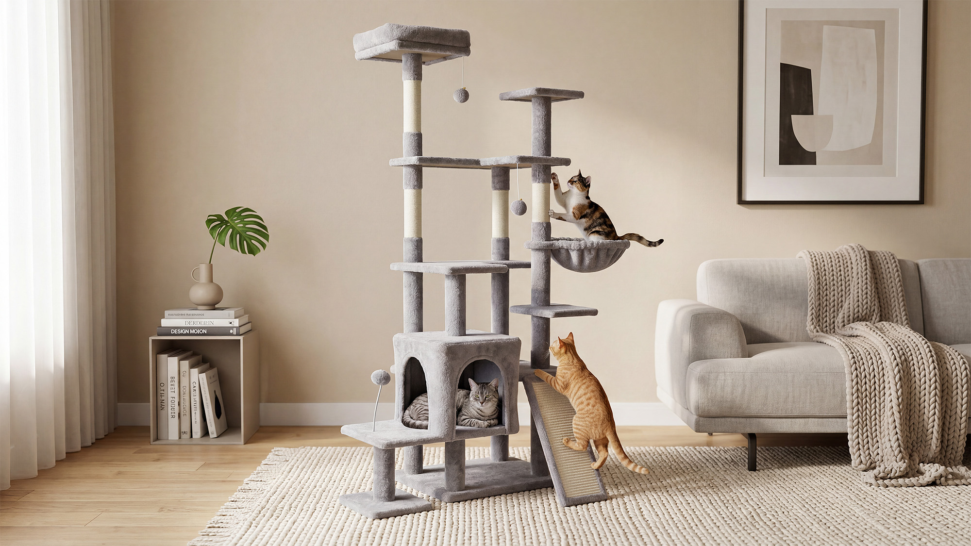 Dwa wygodne legowiska – jedno na szczycie, drugie okrągłe – zapewniają kotu komfortowe miejsce do odpoczynku po zabawie. Miękkie, pluszowe wykończenie sprzyja relaksowi, a podwyższone legowisko pozwala obserwować otoczenie z bezpiecznej pozycji, co daje pupilowi poczucie kontroli i bezpieczeństwa.