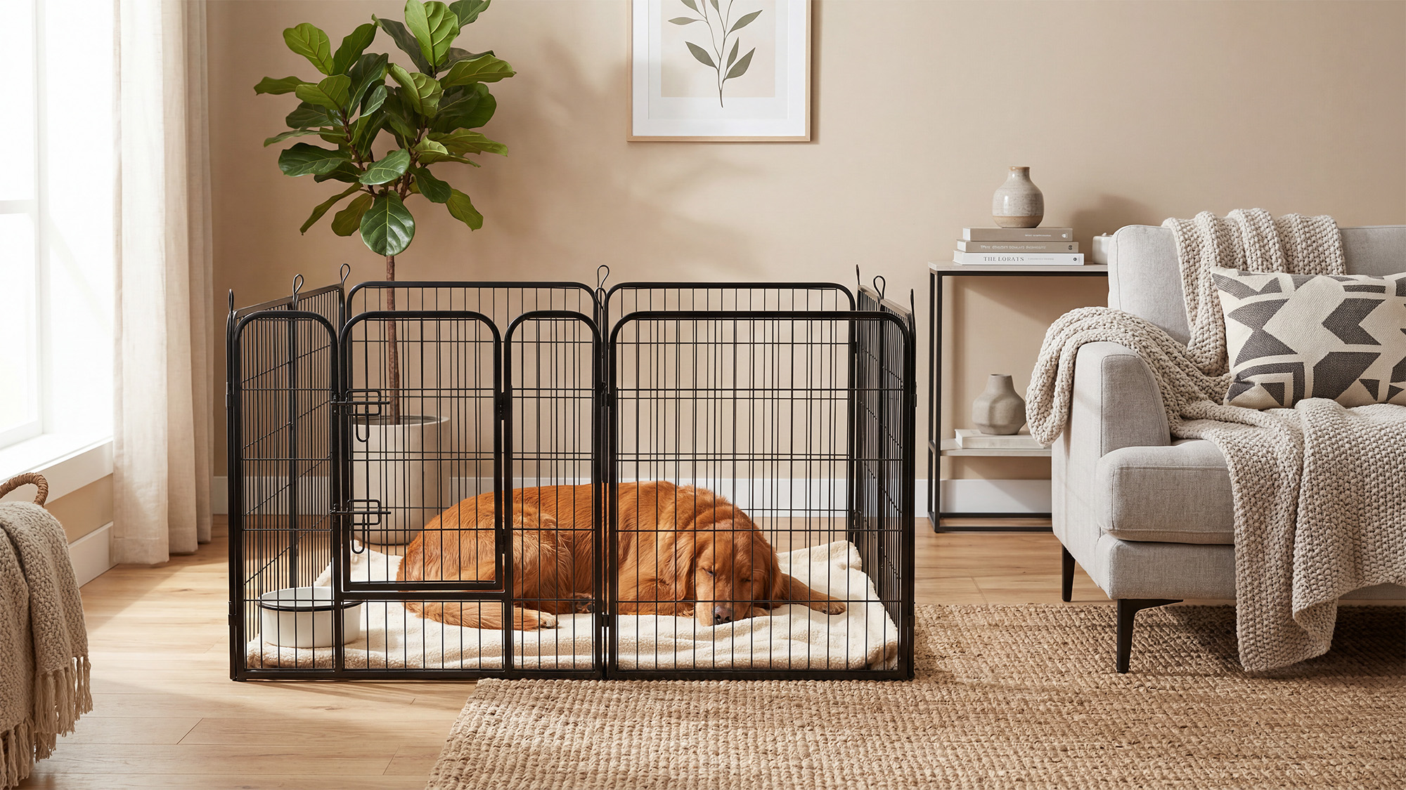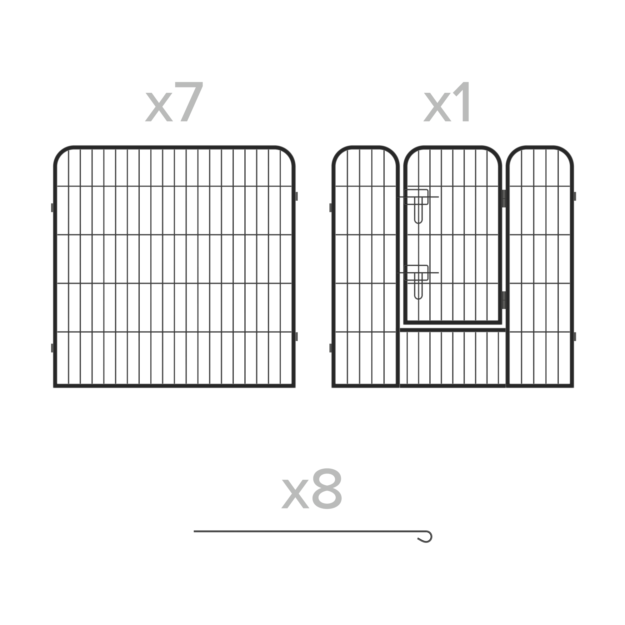 Osiem modułowych paneli pozwala na pełną swobodę konfiguracji kojca, dopasowując jego kształt do przestrzeni i potrzeb pupila. Konstrukcja umożliwia szybki montaż i demontaż oraz łatwą rozbudowę o kolejne elementy. Dzięki temu możesz tworzyć różne warianty zagrody – od kompaktowej przestrzeni po większą strefę zabawy i aktywności.