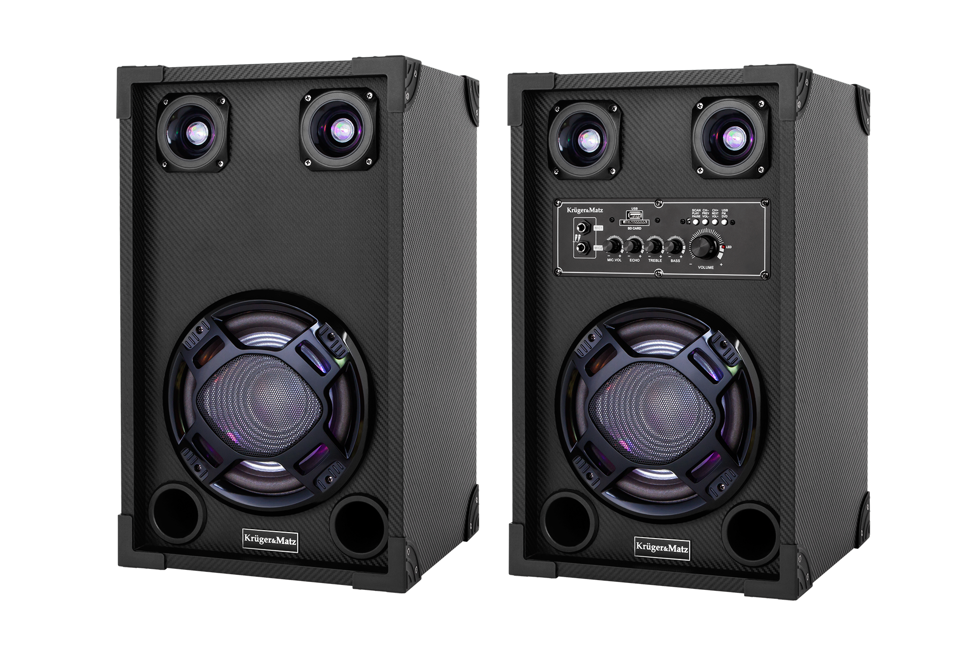 Zestaw Kruger&Matz Stage Lite idealnie sprawdzi się podczas każdej domówki! Każda z kolumn została wyposażona w trzy głośniki - dwa wysokotonowe oraz jeden subwoofer - które wybrzmią z mocą 30 W zapewniając wiele godzin doskonałej zabawy.