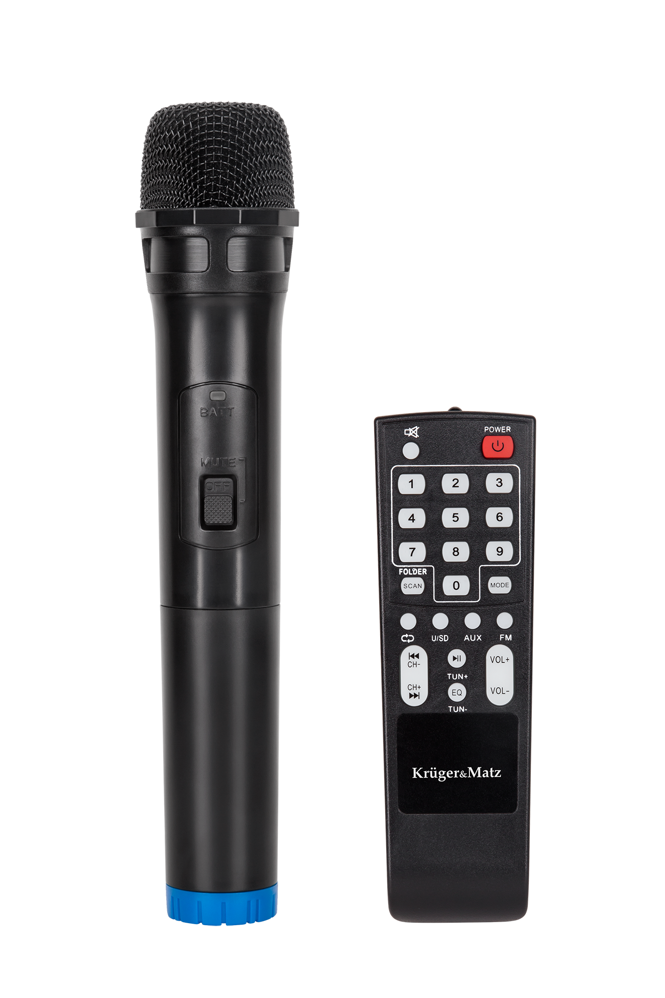W zestawie: bezprzewodowy mikrofon, pilot zdalnego sterowania, instrukcja obsługi