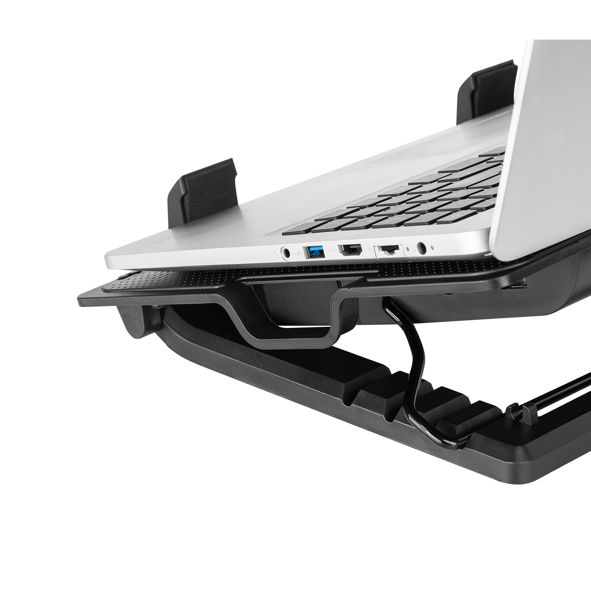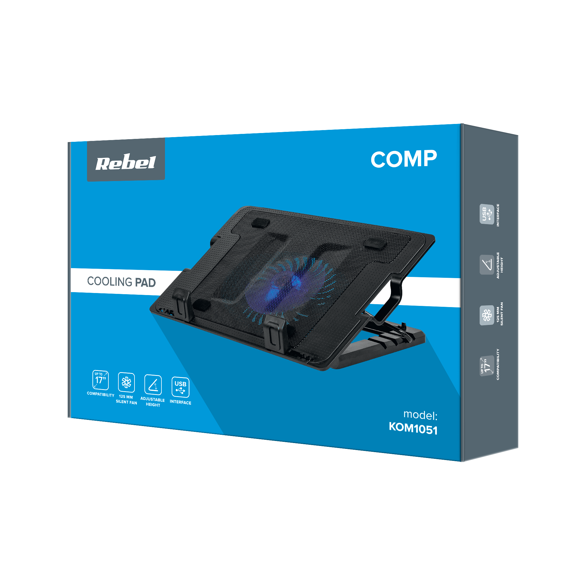 Podstawka pod laptopa z wentylatorem o średnicy 125 mm charakteryzuje się bardzo cichą pracą – poziom głośności to tylko 10 dB. Co ważne, akcesorium to zostało wyposażone w port USB, dlatego pomimo tego, że jest zasilana przez USB, nie zmniejszy funkcjonalności Twojego laptopa. Podkładka chłodząca z serii Rebel nie tylko przedłuży żywotność Twojego komputera, ale będzie także stanowiła doskonałe doposażenie Twojego biura pod względem estetycznym. Czarna, smukła konstrukcja została uzupełniona o niebieskie podświetlenie wentylatora, które nada podstawce nowoczesnego wyglądu. Dodatkowo posiada ona 5-stopniową regulację kąta nachylenia, abyś mógł dostosować położenie laptopa do swoich potrzeb.