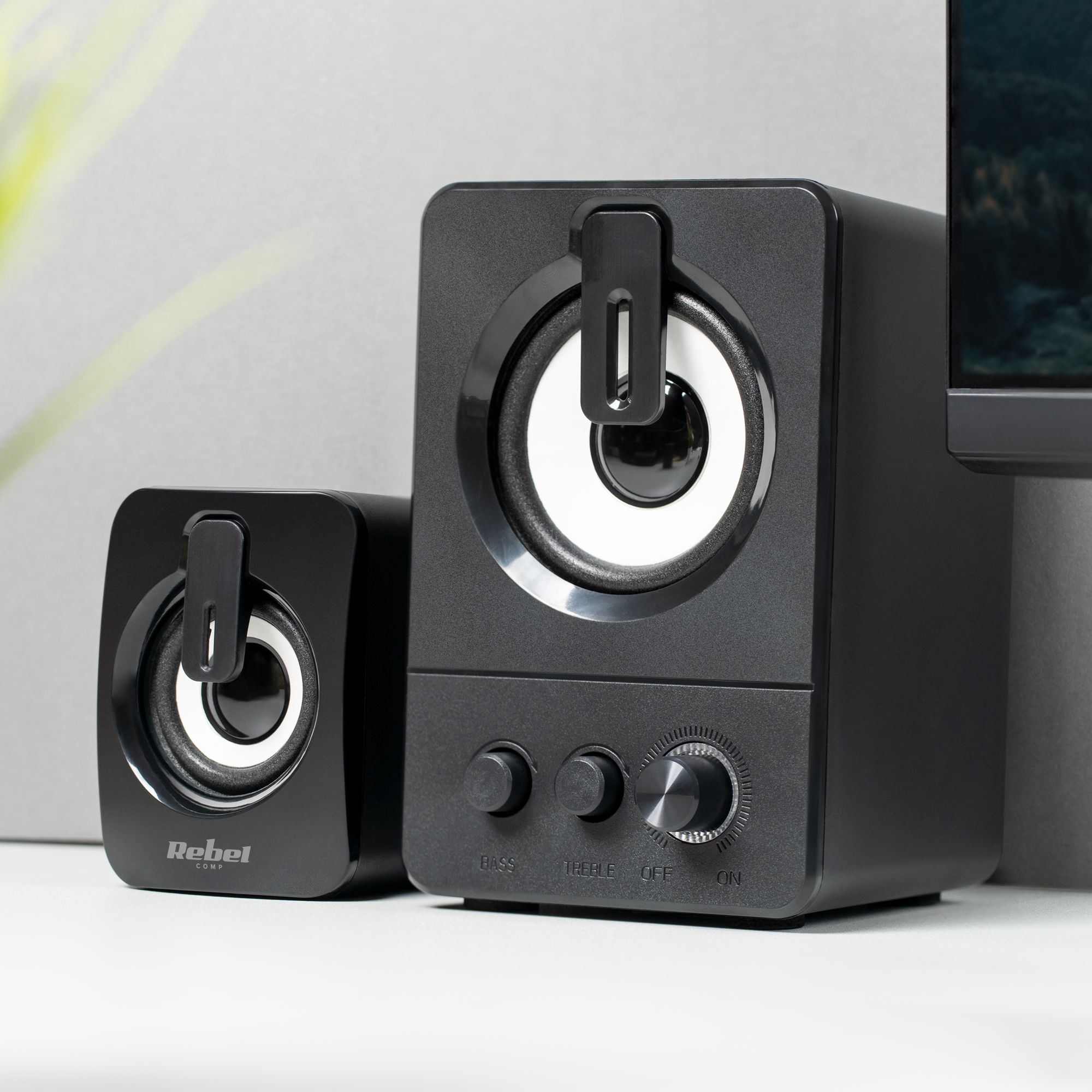 To, co z pewnością zasługuje na uwagę to regulacja tonów niskich i wysokich, która umożliwi Ci dostosowanie brzmienia do Twoich upodobań. Co ważne, zarówno pokrętła regulacji tonów, jak też pokrętło regulacji głośności znajdują się na przedniej obudowie subwoofera, dzięki czemu są one łatwo dostępne i zapewniają komfortowe korzystanie z komputerowych głośników Rebel.