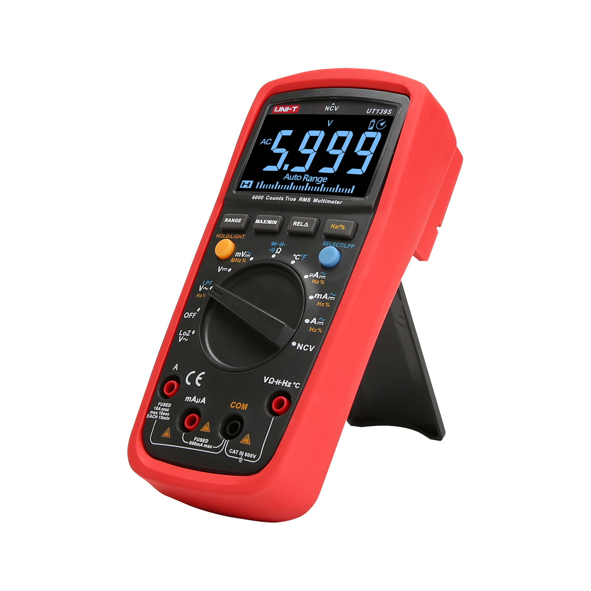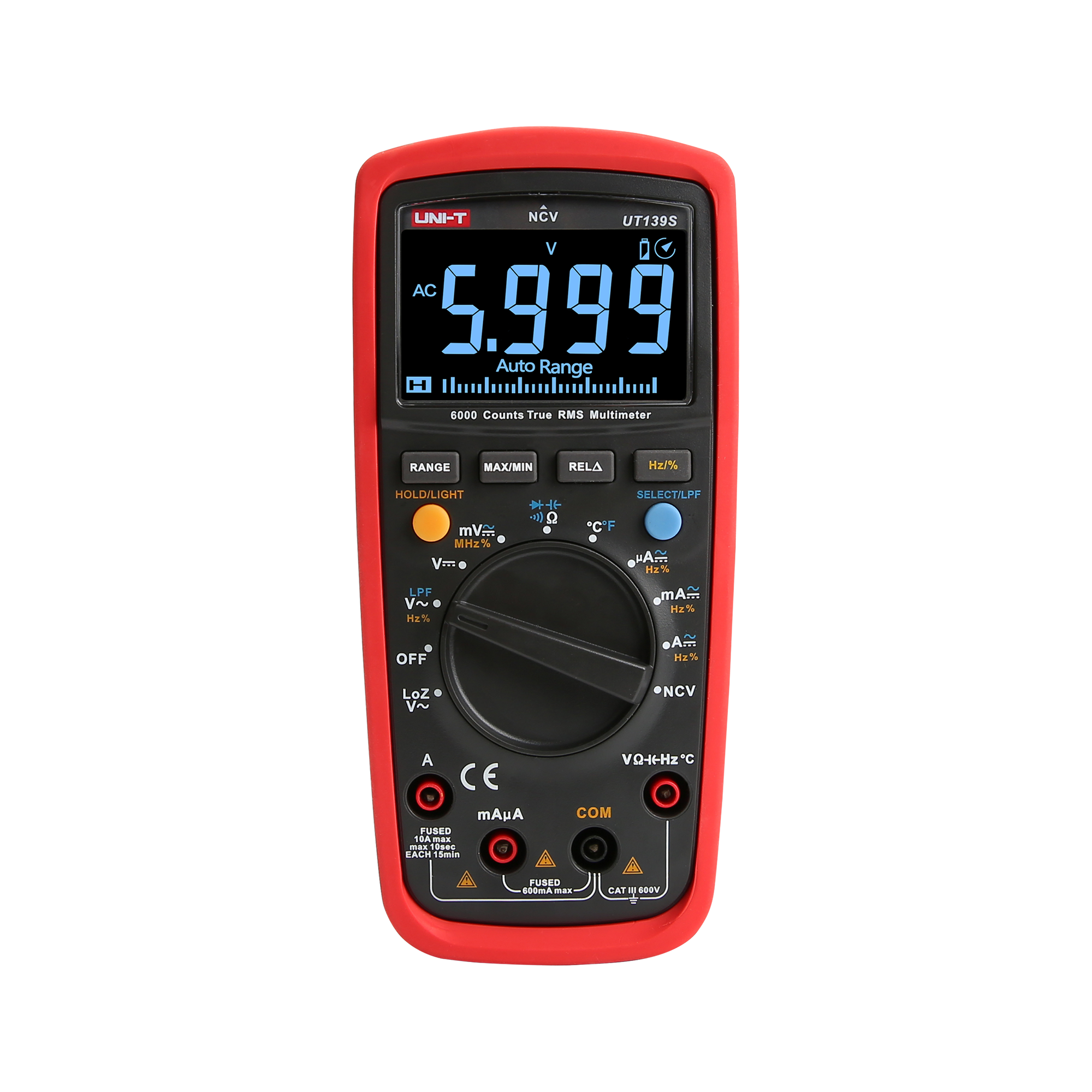 UT139S wyposażony jest w szereg zaawansowanych funkcji, takich jak automatyczna i ręczna zmiana zakresów, pomiar True RMS oraz funkcja wykrywania pola elektrycznego (NCV). Filtr dolnoprzepustowy (LPF) pozwala na precyzyjne pomiary w środowiskach z dużymi zakłóceniami. Dodatkowo, miernik posiada funkcje zapisu wartości MAX/MIN, zamrożenia ostatniego wskazania oraz analogowy bargraf, co ułatwia analizę dynamicznych zmian pomiarowych.