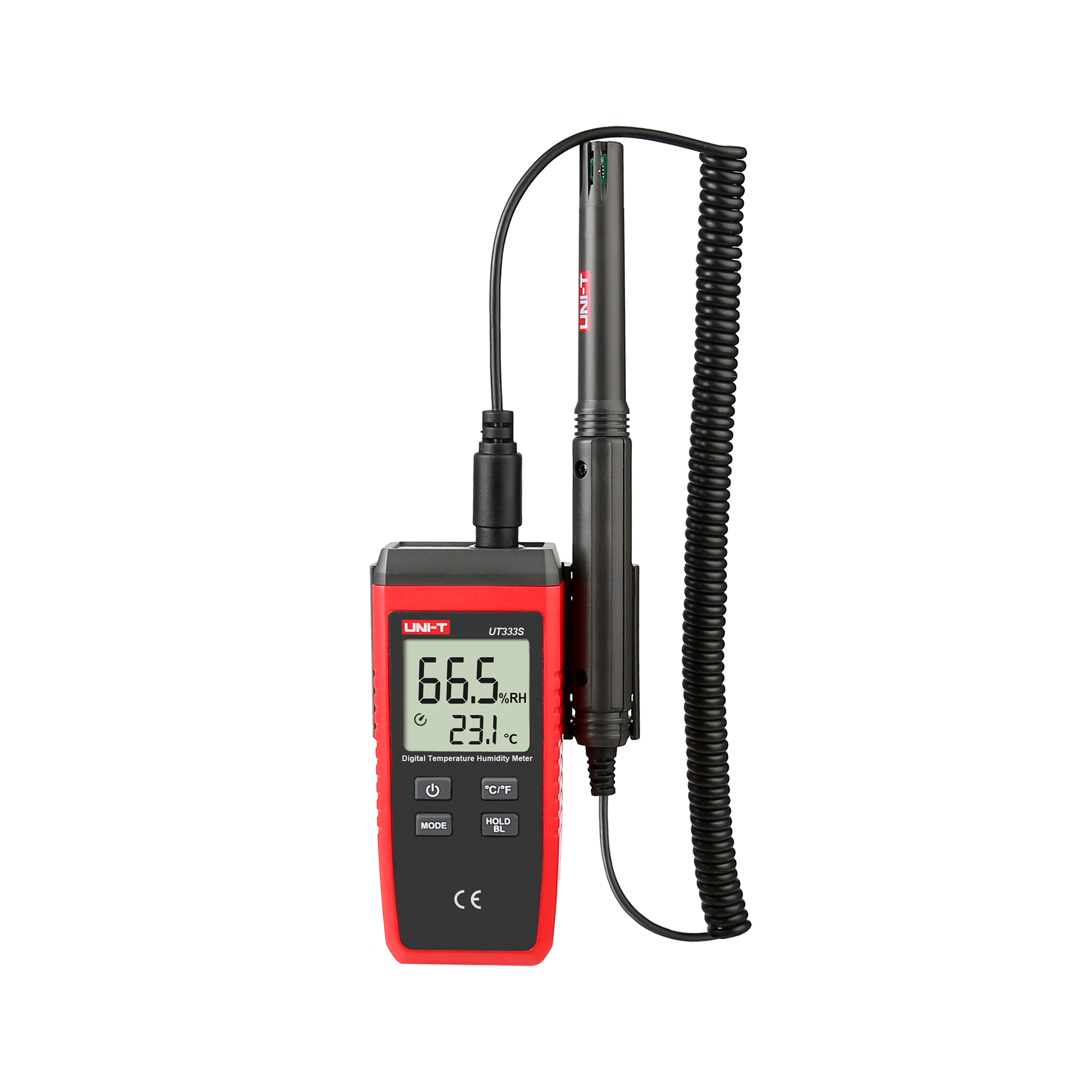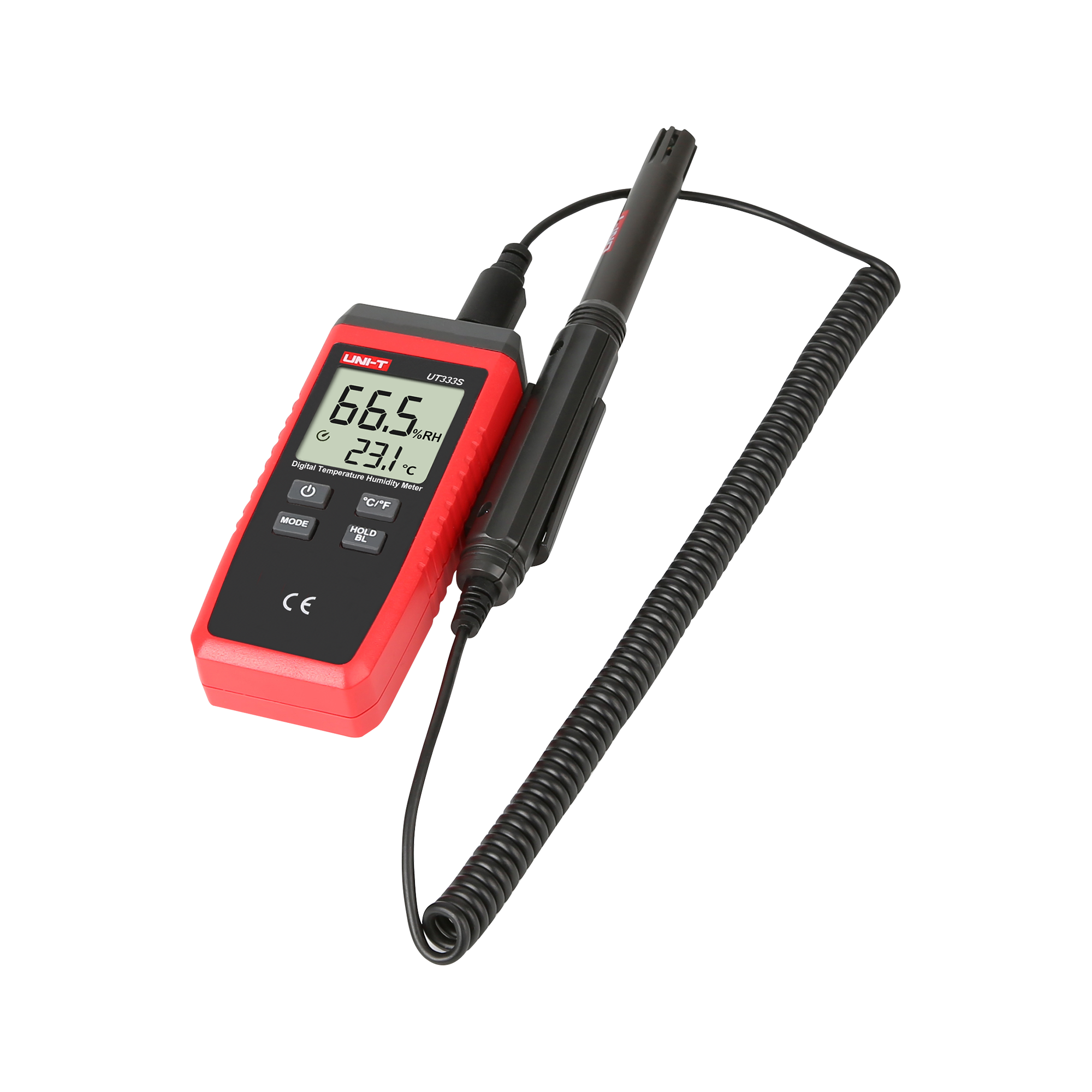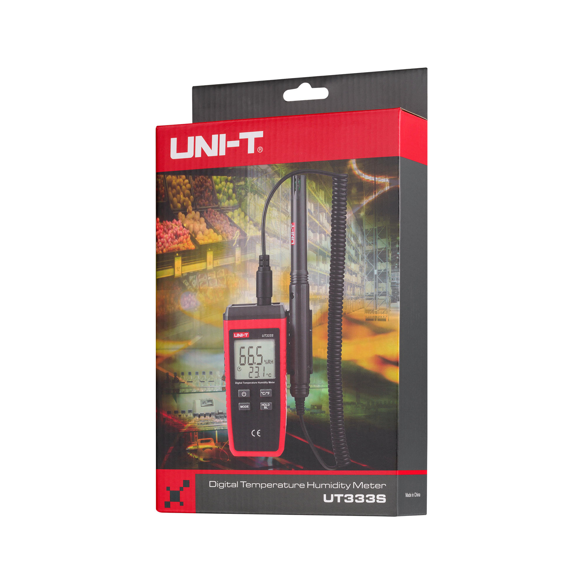 UT333S umożliwia dokładne pomiary temperatury w zakresie od -10°C do 60°C (14°F do 140°F) z rozdzielczością 0,1°C (0,2°F) i dokładnością ±1,0°C (±2,0°F). Miernik oferuje także pomiar wilgotności w pełnym zakresie od 0% do 100% RH, z rozdzielczością 0,1% RH i dokładnością ±5% w zakresie od 20% do 80% RH. Dzięki tym parametrom, urządzenie jest idealne do monitorowania zarówno temperatury, jak i wilgotności w różnych warunkach.