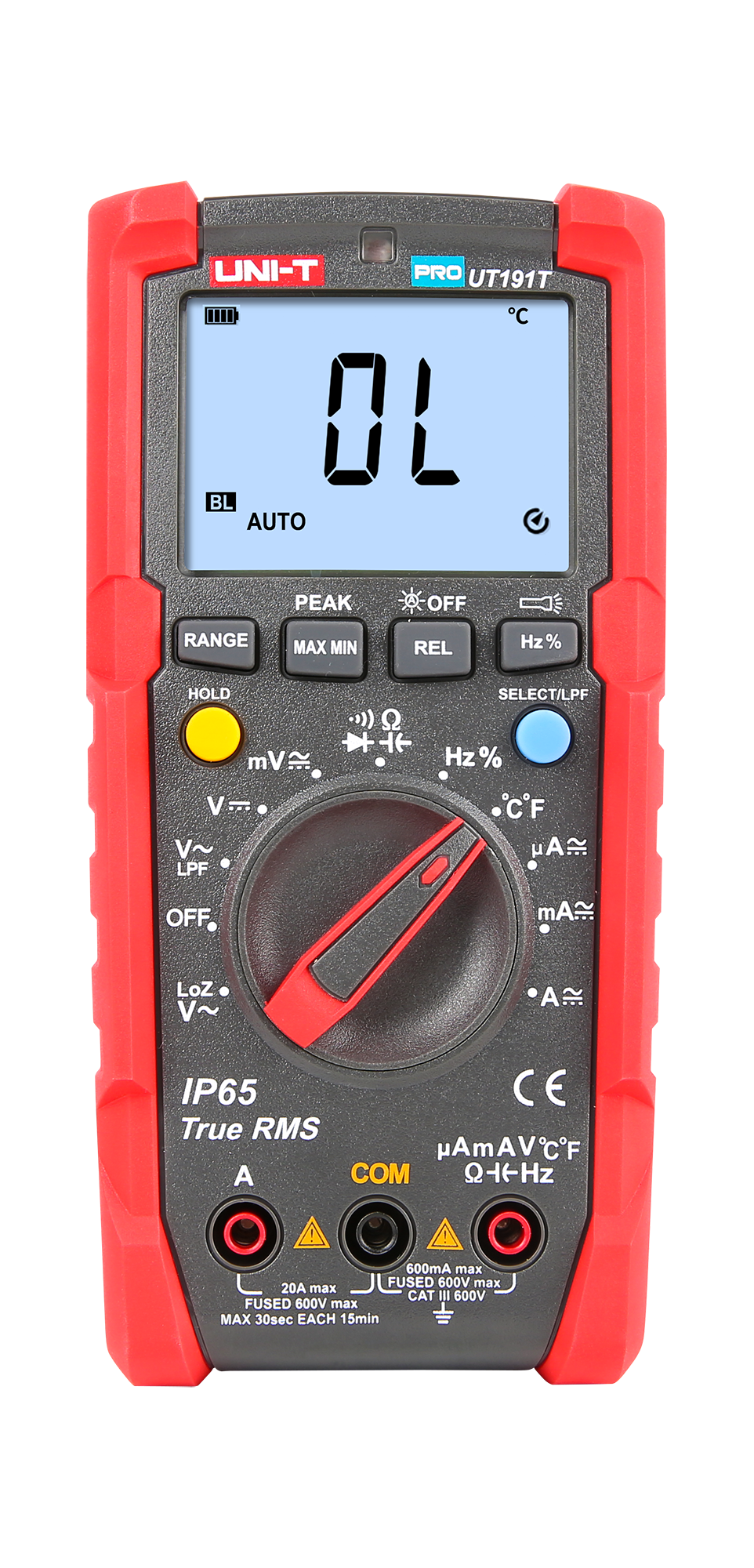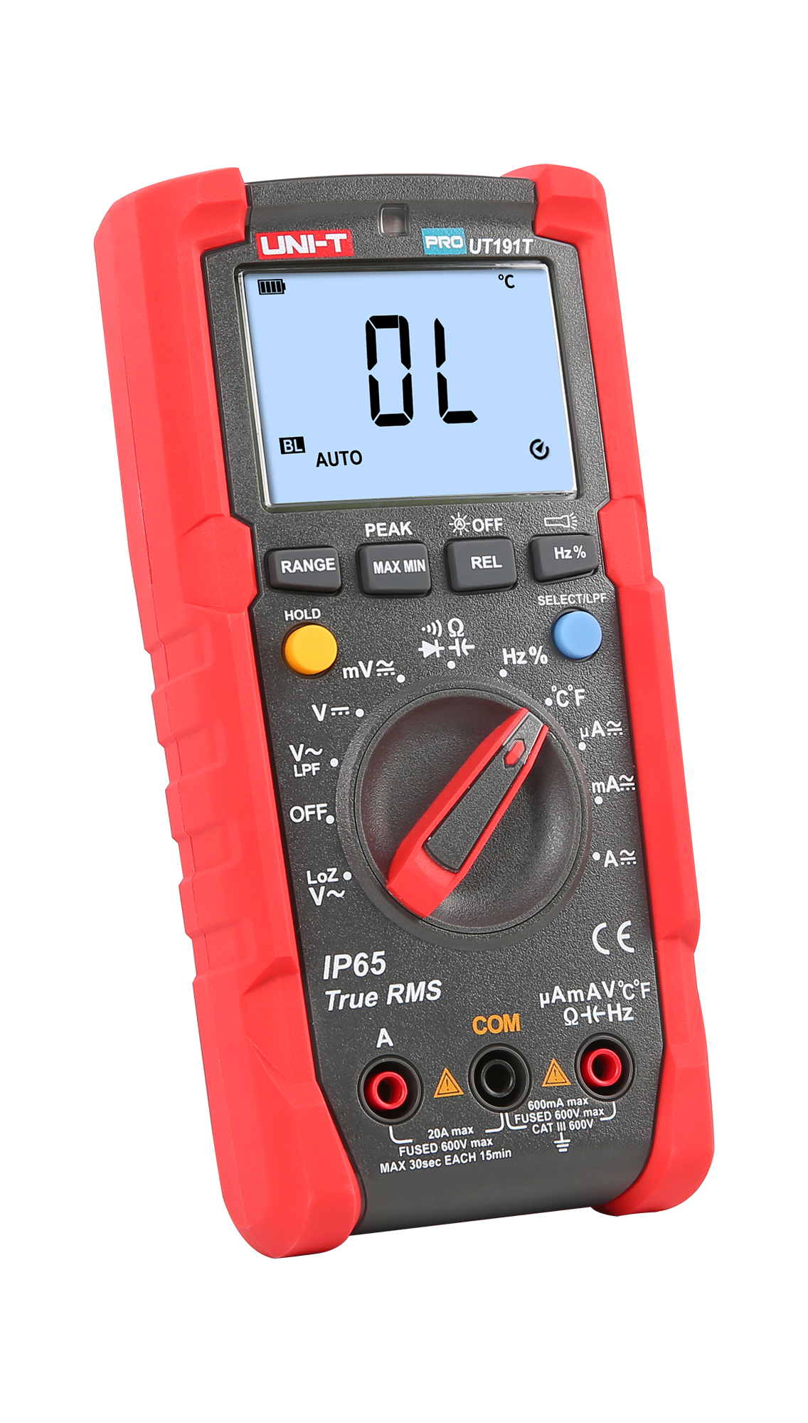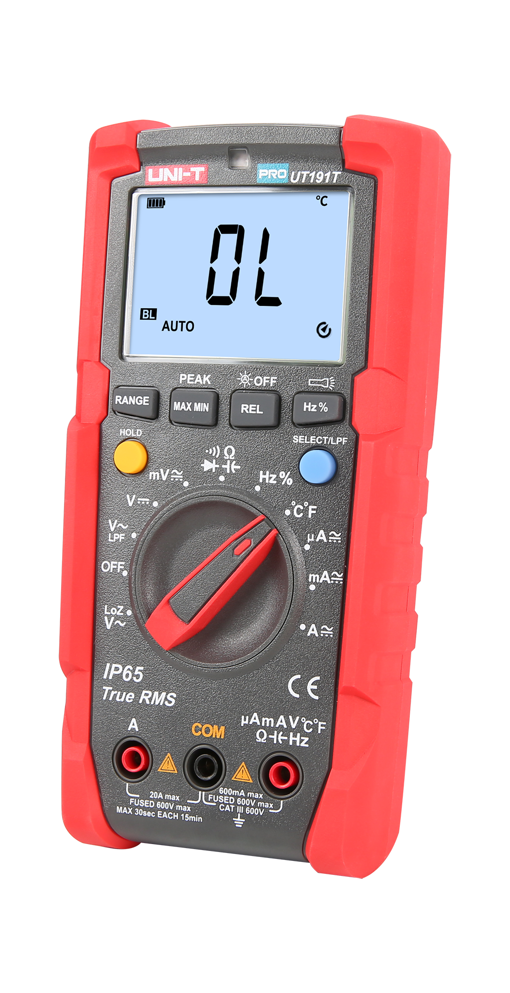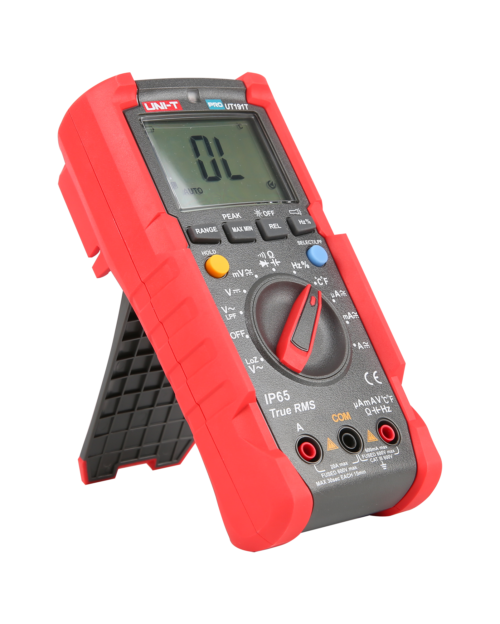 UT191T umożliwia precyzyjne pomiary napięcia stałego do 600 V oraz zmiennego do 600 V z dokładnością ±(0,5%+3) dla DC i ±(0,7%+3) dla AC. Miernik obsługuje również pomiary natężenia prądu stałego i zmiennego do 20 A, co pozwala na pracę z różnorodnymi obwodami. Dodatkowo, miernik oferuje pomiar rezystancji do 60 MOhm, pojemności do 60 mF, częstotliwości do 1 MHz oraz temperatury od -40°C do 400°C, co tworzy go niezwykle wszechstronnym narzędziem.