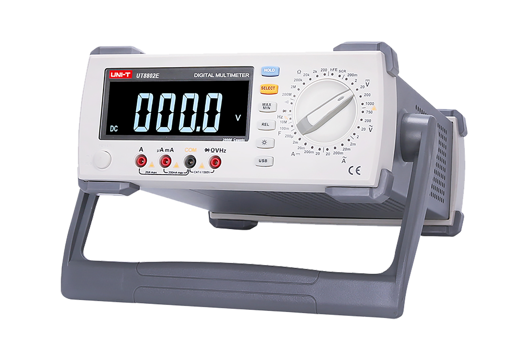 UT8802E oferuje szeroki zakres pomiaru napięcia stałego (DC) od 200 mV do 1000 V z wysoką dokładnością ±(0,1%+3). Urządzenie umożliwia również pomiar napięcia zmiennego (AC) do 750 V z dokładnością ±(0,5%+20). Miernik obsługuje pomiar natężenia prądu stałego i zmiennego do 20 A, rezystancji do 200 M? oraz pojemności do 100 mF, co czyni go wszechstronnym narzędziem do analizy różnorodnych układów elektrycznych.