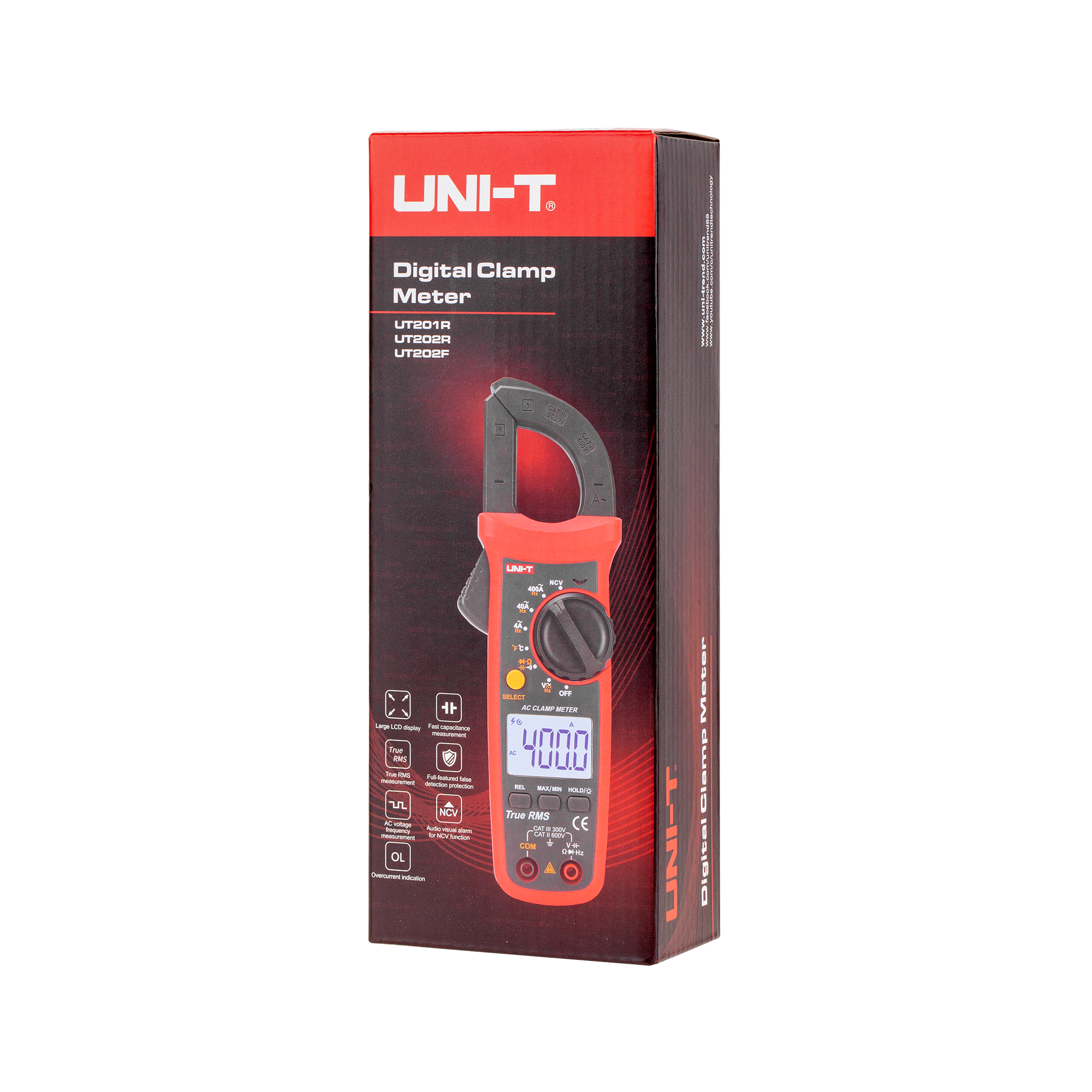 UT202R umożliwia pomiar napięcia stałego do 600 V oraz napięcia zmiennego również do 600 V, co sprawia go odpowiednim do pracy z różnorodnymi instalacjami elektrycznymi. Miernik pozwala również na pomiar natężenia prądu zmiennego do 400 A, co jest kluczowe w pracy z obwodami o dużym obciążeniu. Dodatkowo, UT202R oferuje pomiar rezystancji do 40 MOhm, pojemności do 4 mF oraz temperatury w zakresie od -40°C do 1000°C, co zwiększa jego wszechstronność w testowaniu komponentów elektrycznych i elektronicznych.