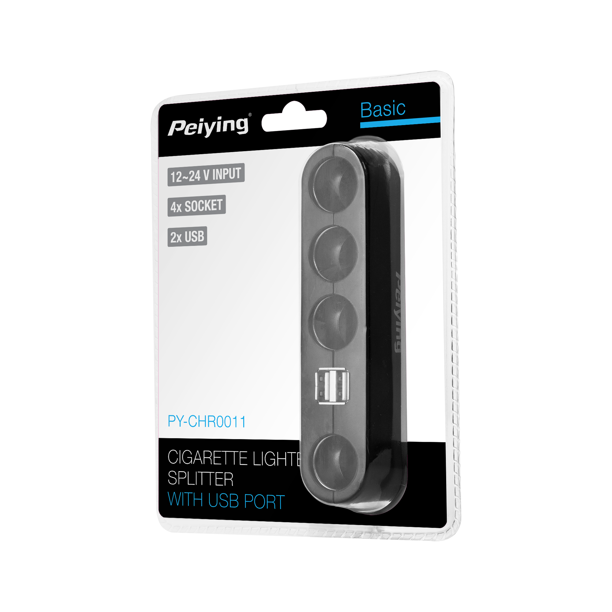 Rozdzielacz oferuje cztery gniazda zapalniczki, co umożliwia zasilanie różnych urządzeń jednocześnie, takich jak nawigacja GPS, wideorejestrator czy ładowarka do telefonu. Dodatkowy port USB o napięciu wyjściowym 5 V i prądzie 2 A zapewnia szybkie ładowanie urządzeń mobilnych.