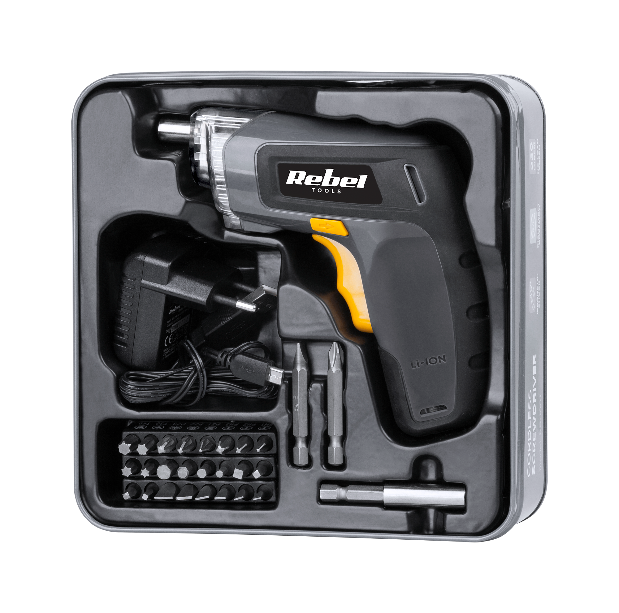 Już po chwili zauważysz jak komfortowa w użyciu jest wkrętarka Rebel Tools. Urządzenie zostało wyposażone w magnetyczny uchwyt, dlatego zmiana końcówek odbywa się niezwykle szybko. Narzędzie posiada także światło robocze, które podświetli Ci miejsce wkręcania. Jedną z cech, które docenisz od pierwszych chwil użytkowania to bezprzewodowa praca. Litowo-jonowy akumulator o pojemności 1,3 Ah, w jaki została wyposażona wkrętarka, gwarantuje długą żywotność i dużą wydajność. Zaletami urządzenia są także cicha praca oraz lekka konstrukcja – tylko 380 g, które znacznie podnoszą komfort podczas pracy.