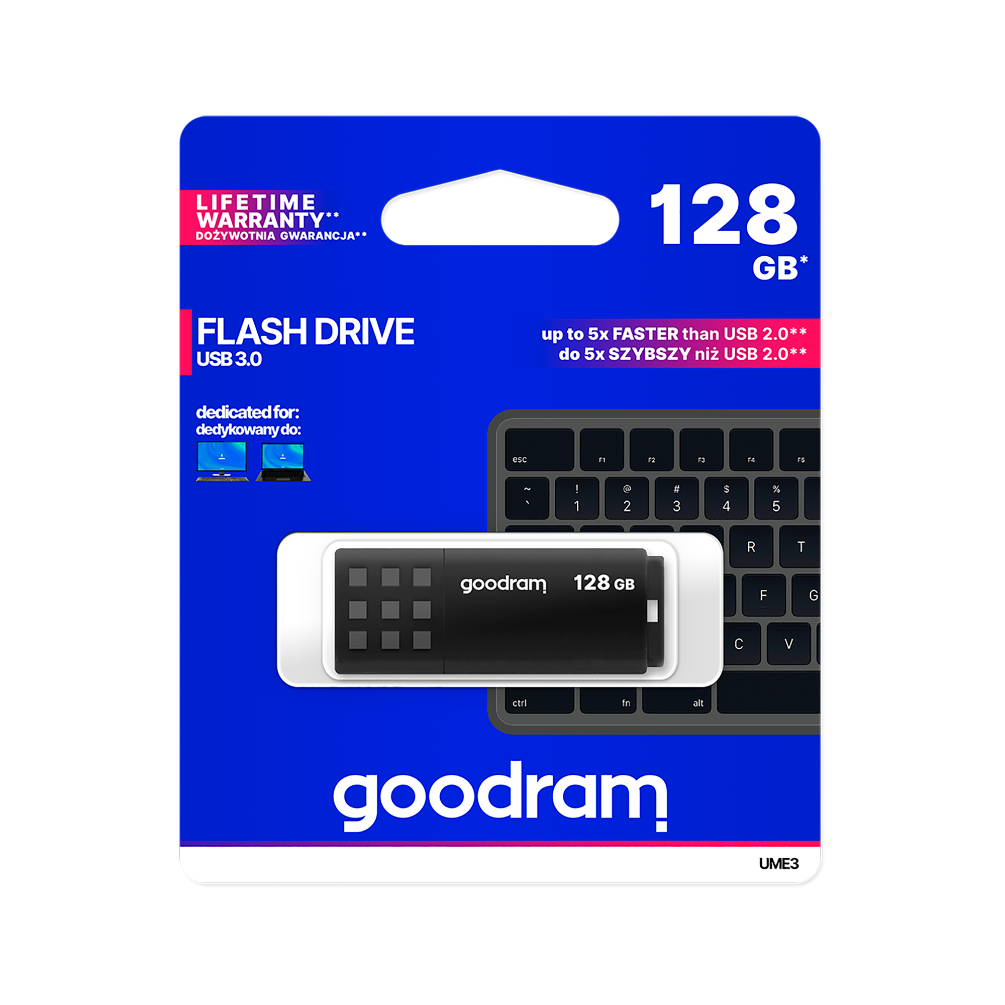 UME3 to klasyczny design, przełamany intensywnością kolorów obudowy. Zatyczka z wypukłym antypośligowym wzorem ułatwia otwarcie USB w każdej sytuacji. Po zdjęciu zatyczki można ją nałożyć na drugi koniec obudowy – daje to pewność, że się nie zgubi. Idealnym rozwiązanie dla tych, którzy lubią mieć pamięci USB zawsze przy sobie, jest perforacja umożliwiająca przypięcie zawieszki.Pamięć UME3 dostępna jest w pojemnościach od 16 GB do 128 GB. Użyte komponenty pozwalają uzyskać prędkości odczytu do 60 MB/s i zapisu do 20 MB/s. Podobnie jak wszystkie inne pamięci USB marki GOODRAM, UME3 objęty jest dożywotnią gwarancją producenta.