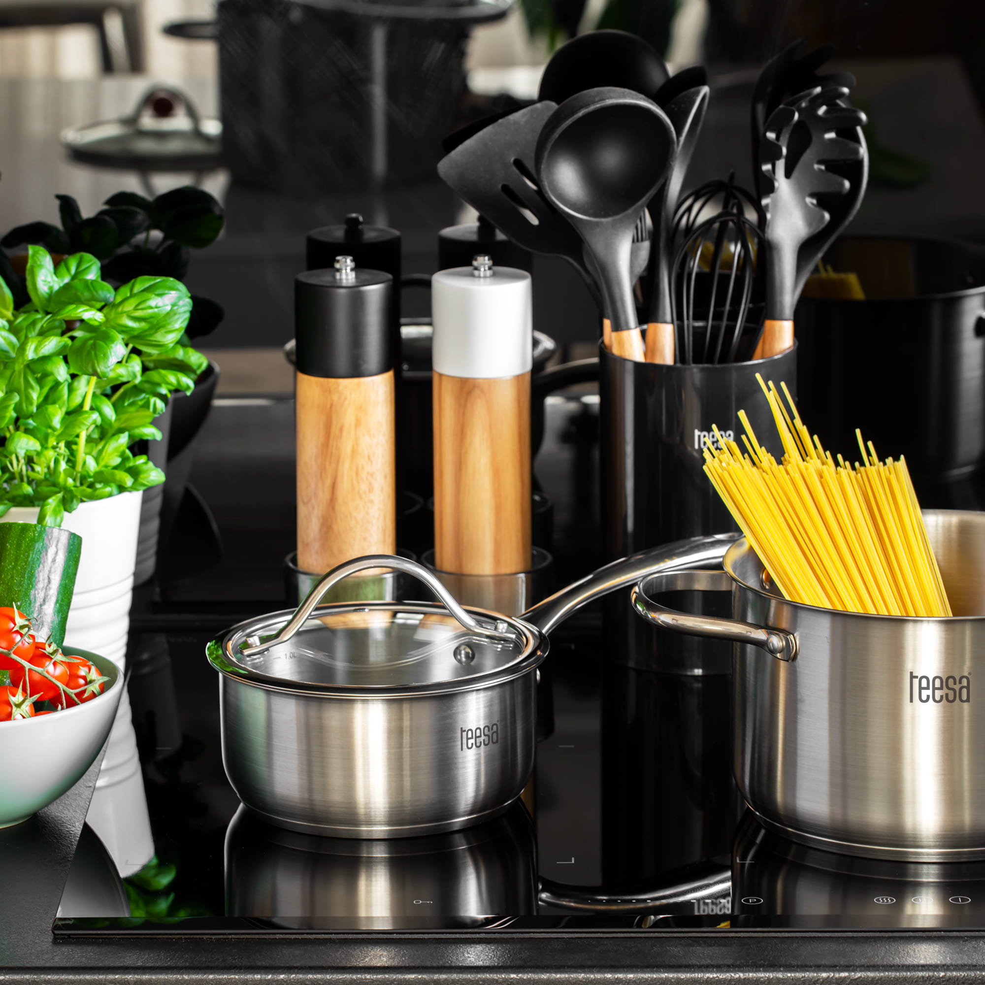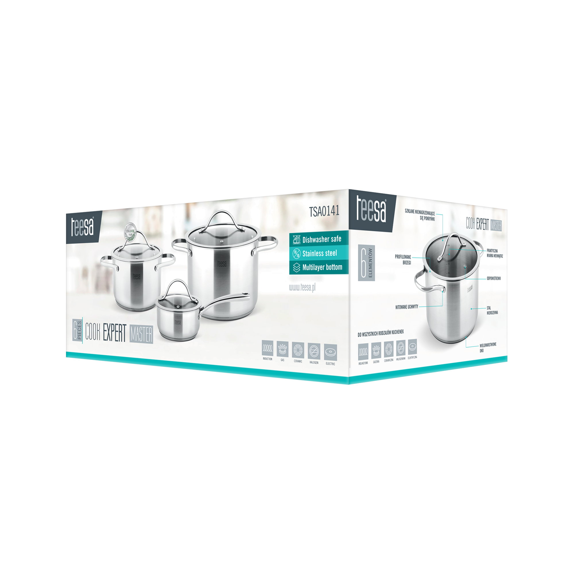 Solidne garnki ze stali nierdzewnej, to podstawa w każdej kuchni. Dlatego z myślą o tym przygotowany został komplet garnków Teesa COOK EXPERT MASTER. W skład zestawu wchodzą: garnek ze stali nierdzewnej o pojemności 6 litrów i 3 litry, 1-litrowy rondel oraz trzy pokrywki, czyli idealny komplet, który ułatwi Ci przyrządzanie różnego rodzaju potraw. Odpowiednia budowa garnków z profilowanymi brzegami, wspiera komfort użytkowania, niwelując ryzyko rozlania potraw na kuchence oraz blatach.