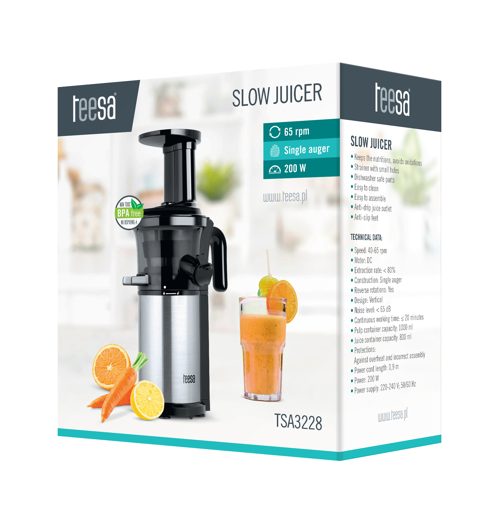 Lubisz zaczynać dzień od dawki witamin? Z pewnością pokochasz nową wyciskarkę wolnoobrotową Teesa do warzyw i owoców. Urządzenie jest wolne od BPA – to znaczy, że zostało wyprodukowane bez użycia materiałów zawierających bisfenol, co jest szczególnie ważne dla walorów zdrowotnych wyciskanego soku. Pionowa konstrukcja oraz obudowa ze stali nierdzewnej sprawiają, że wyciskarka nie zajmuje wiele miejsca na blacie i doskonale współgra z wyposażeniem nowoczesnej kuchni.