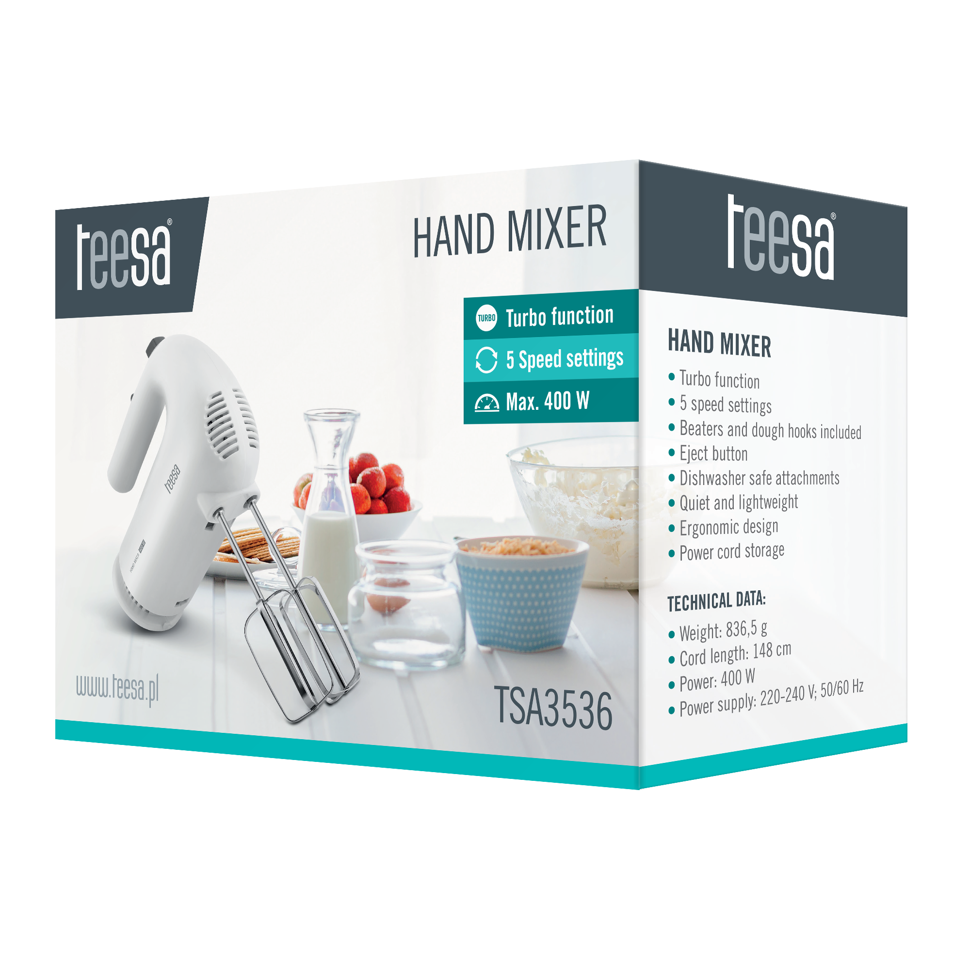 TSA3536 to mikser, któremu nie straszne Twoje kulinarne zachcianki. Pięć ustawień prędkości oraz funkcja Turbo w połączeniu z zestawem końcówek do ubijania oraz wyrabiania ciasta sprawiają, że przygotowywane przez Ciebie wszelkie kremy, ciasta, masy czy sosy będą idealne.