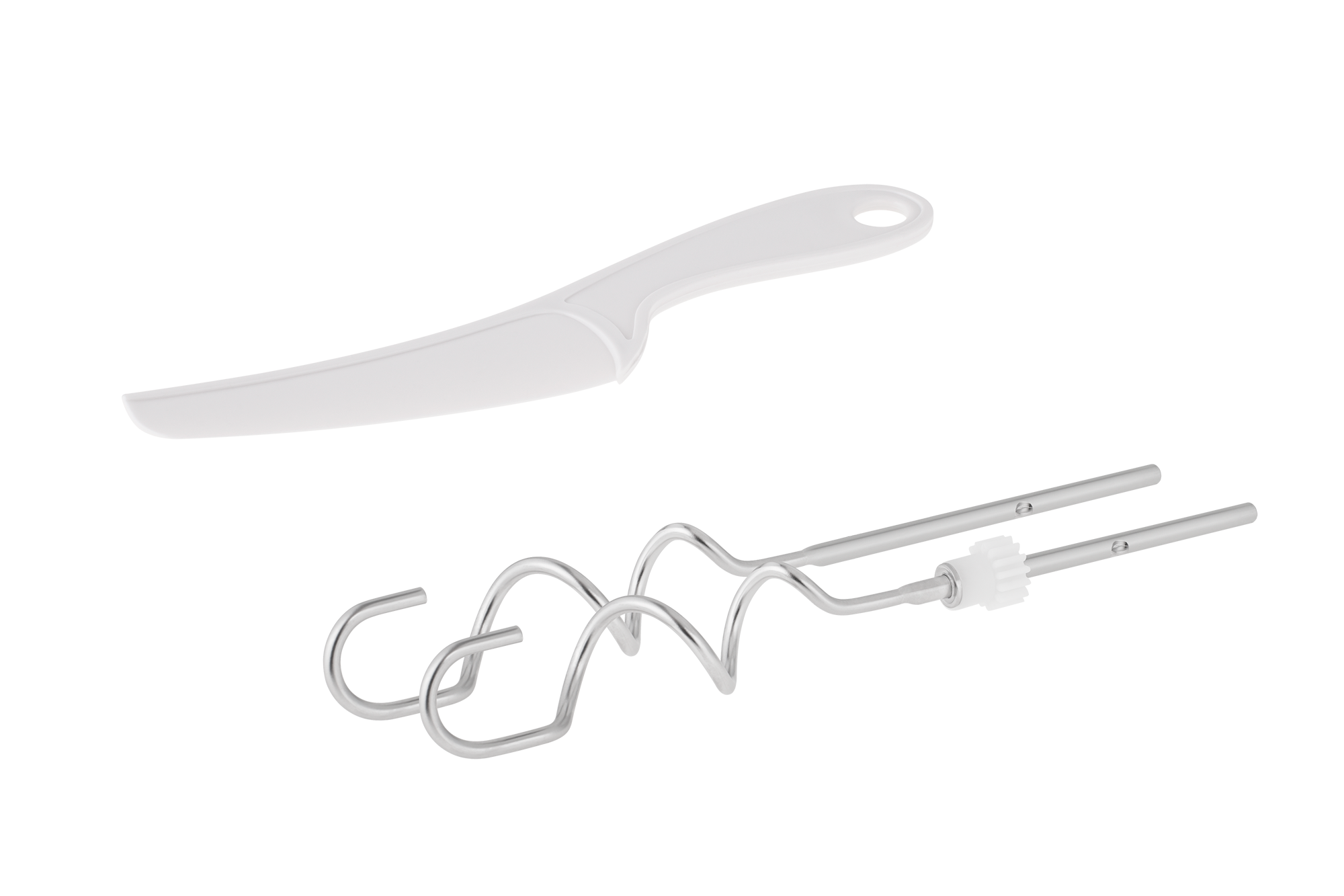 W zestawie: misa, pokrywa misy, podstawa, trzepaczki, mieszadła, łopatka, instrukcja obsługi