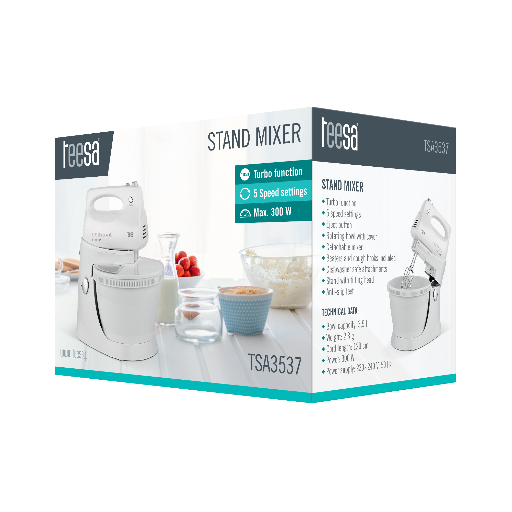 Każda Pani Domu wie, że wyposażenie jej kuchni nie jest pełne, jeśli wśród urządzeń nie ma miksera. Już teraz zastąp swój stary mikser nowym modelem Teesa TSA3537. W odróżnieniu od zwykłego miksera ręcznego, urządzenie to posiada stabilną podstawę z obrotową misą o pojemności 3,5 litra, co sprawia, że prace kuchenne przestaną być żmudnym obowiązkiem i zmienią się w prawdziwą pasję kulinarną. Dodatkową zaletą jest pokrywa zapobiegająca chlapaniu, która pomoże Ci utrzymać porządek w Twojej kuchni.