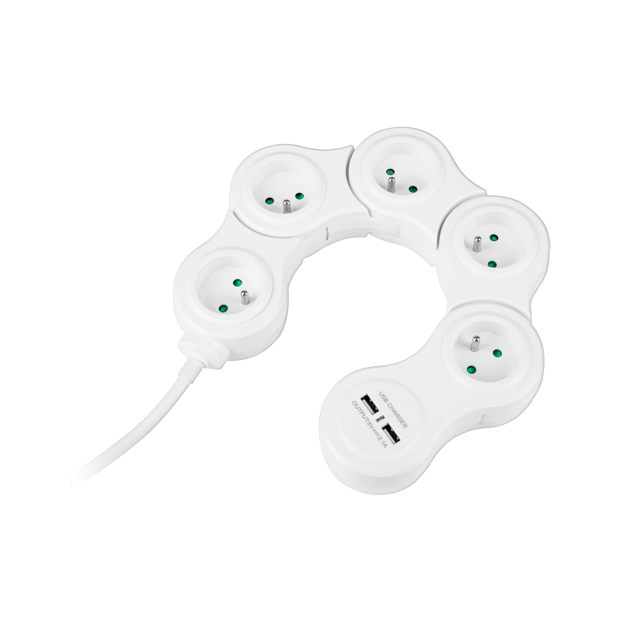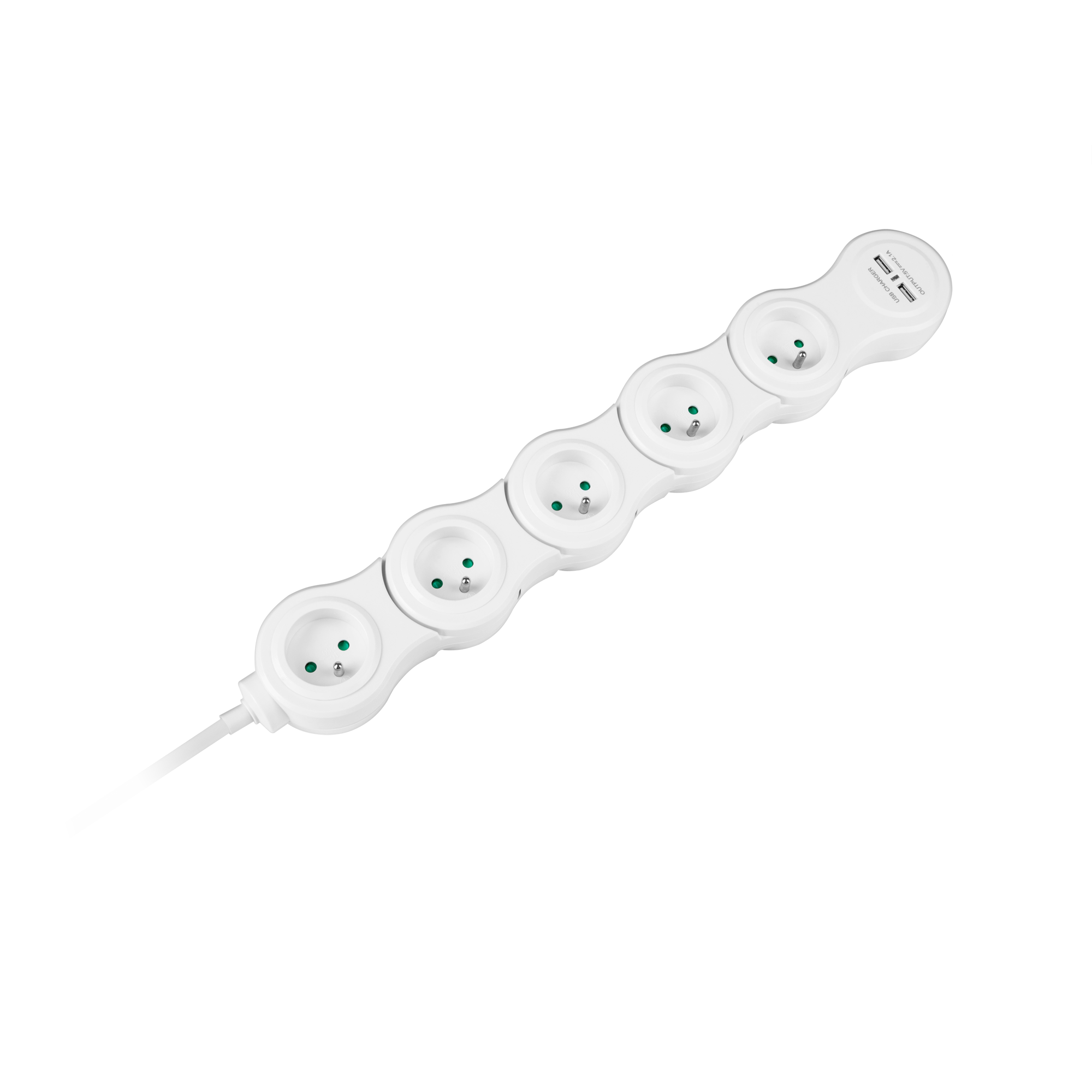 Przedłużacz wyposażony jest w pięć gniazd sieciowych, które pozwalają na jednoczesne podłączenie różnych urządzeń elektrycznych, takich jak komputery, telewizory czy ładowarki. Dodatkowo, dwa porty USB o łącznym natężeniu 2,4 A umożliwiają szybkie ładowanie urządzeń mobilnych bez konieczności używania dodatkowych ładowarek.