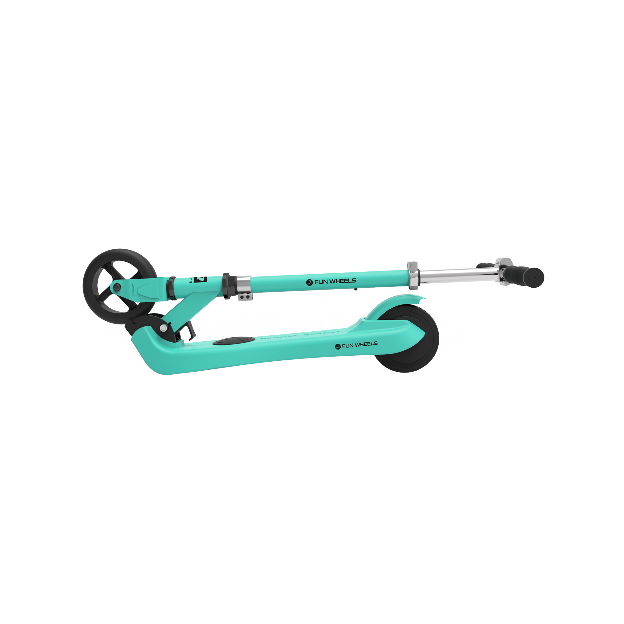 Dziecięca hulajnoga elektryczna Fun Wheels posiada wbudowany w platformę nożny napęd, jednak w przeciwieństwie do tradycyjnych modeli hulajnóg elektrycznych pojazd ten ruszy dopiero po odepchnięciu. To znacznie zwiększa bezpieczeństwo i podnosi komfort podczas jazdy.