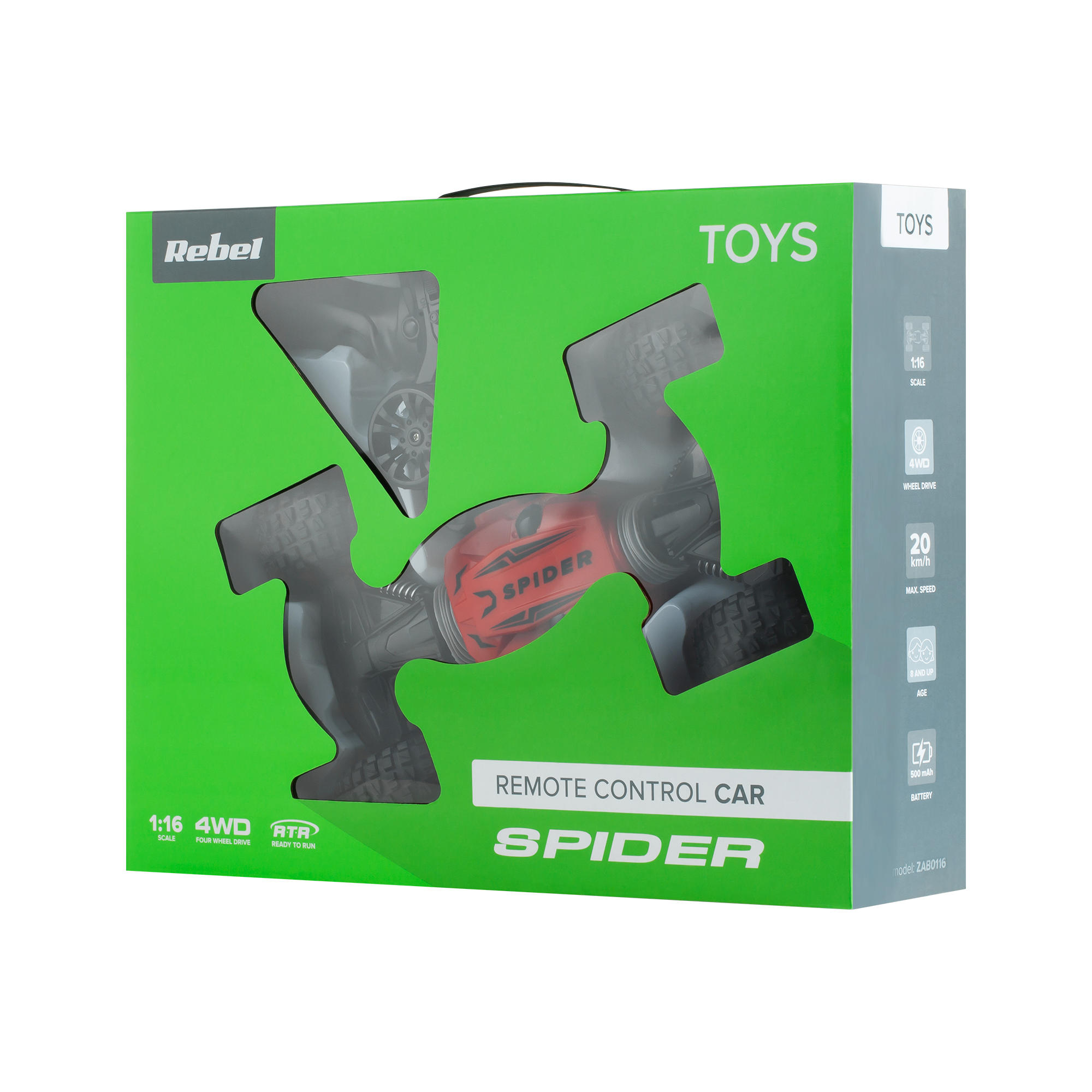 Poczuj zatem wyścigowe emocje bez ograniczeń. Dwustronne auto Rebel Spider z napędem na cztery koła, rozwijając prędkość do 20 km/h doskonale poradzi sobie w każdym terenie. Zasięg pilota do 40 metrów w połączeniu z funkcjonalnością samochodu, sprawia, że gdy pojazd zderzy się z przeszkodą i dachuje, nie musisz ingerować i samodzielnie go odwracać, tylko dalej być w grze! Gdy samochód dachuje w trybie terenowym, wystarczy, że naciśniesz przycisk deformacji, a konstrukcja pojazdu wydłuży się, co umożliwi dalszą jazdę.
