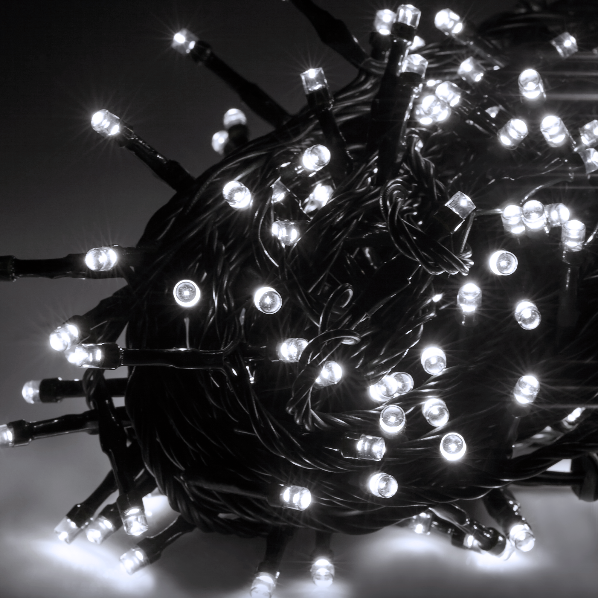 Zestaw składa się ze 100 diod LED, które emitują jasne, zimne białe światło, tworząc czysty i wyraźny efekt świetlny. Lampki mają długość 10 metrów, a diody rozmieszczone są co 10 cm, co zapewnia równomierne rozproszenie światła i nadaje dekoracji elegancki wygląd.