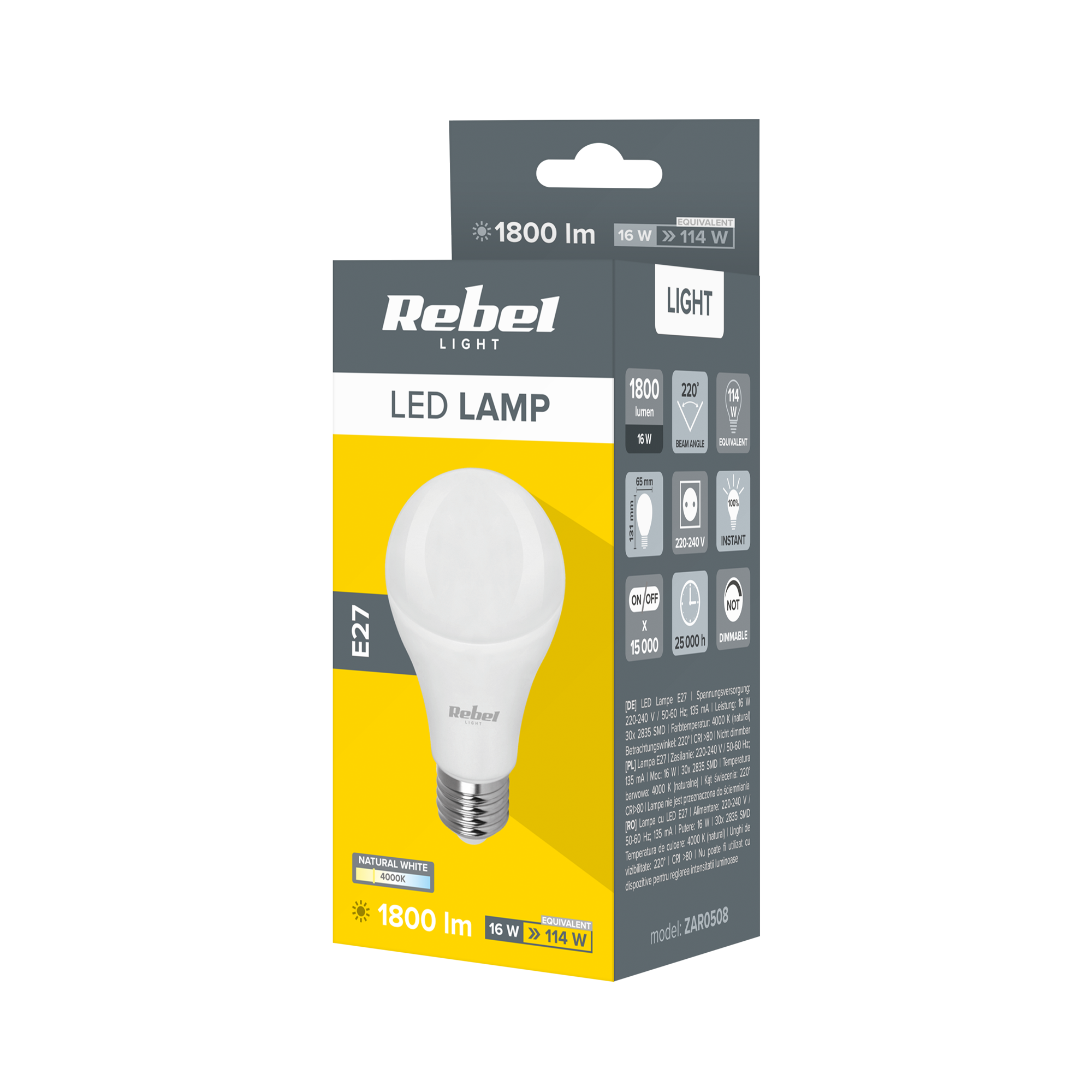 Żarówka LED o mocy 16 W i 1800 lm z serii Rebel to gwarancja wysokiej wydajności i niskiego zużycia energii. Charakteryzuje się długą żywotnością oraz szerokim, 220-stopniowym kątem świecenia w naturalnym kolorze. Lampa LED marki Rebel zalicza się do klasy energetycznej E i jest zgodna z ostatnimi rozporządzeniami Komisji Europejskiej dotyczącymi etykietowania energetycznego źródeł światła oraz wymogów dotyczących ekoprojektu dla źródeł światła.